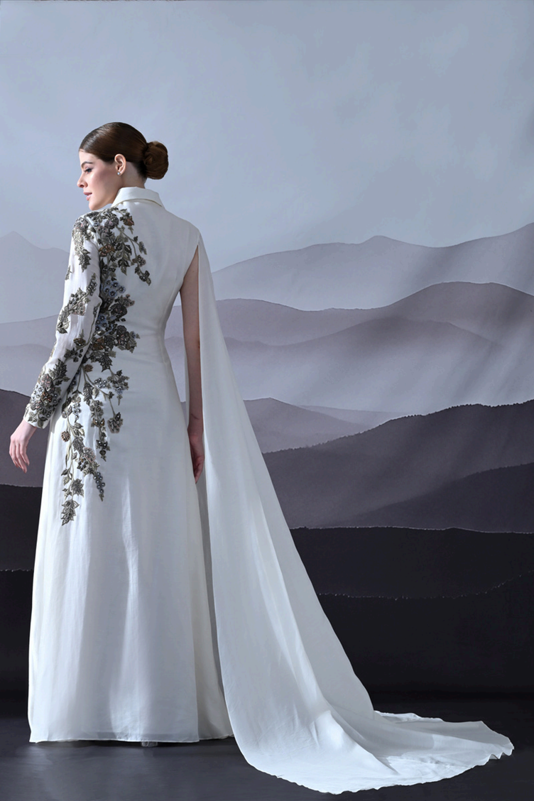 An elegant Gown with A high, mandarin collar, A flowing cape-like overlay draping from the shoulders and floral embellishments concentrated along one side of the cape