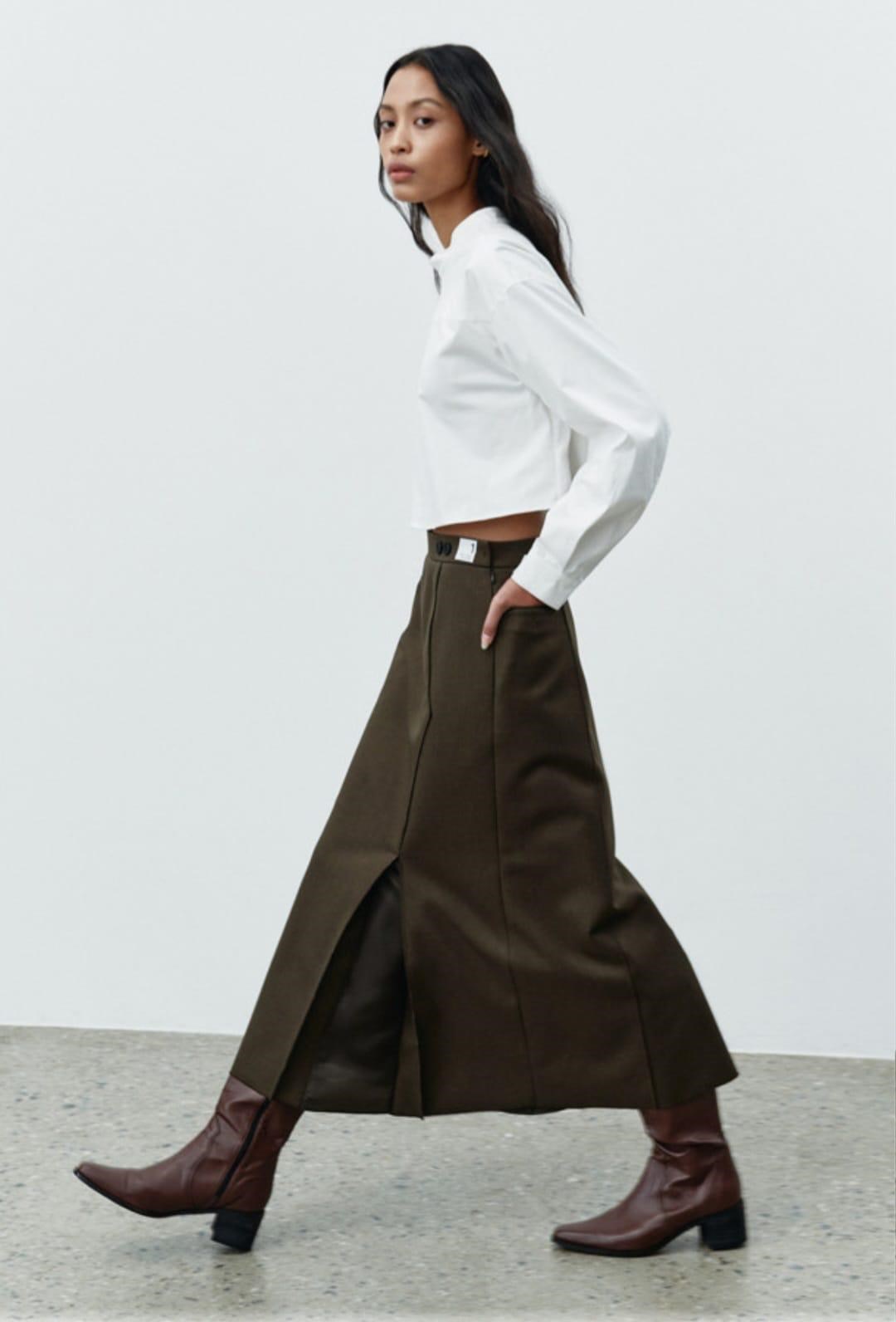 The Backward oversized shirt. The shirt has a loose fit and long sleeves, giving it an oversized appearance. The shirt is paired with a long brown skirt and brown boots. The overall look is casual and comfortable, suitable for everyday wear.