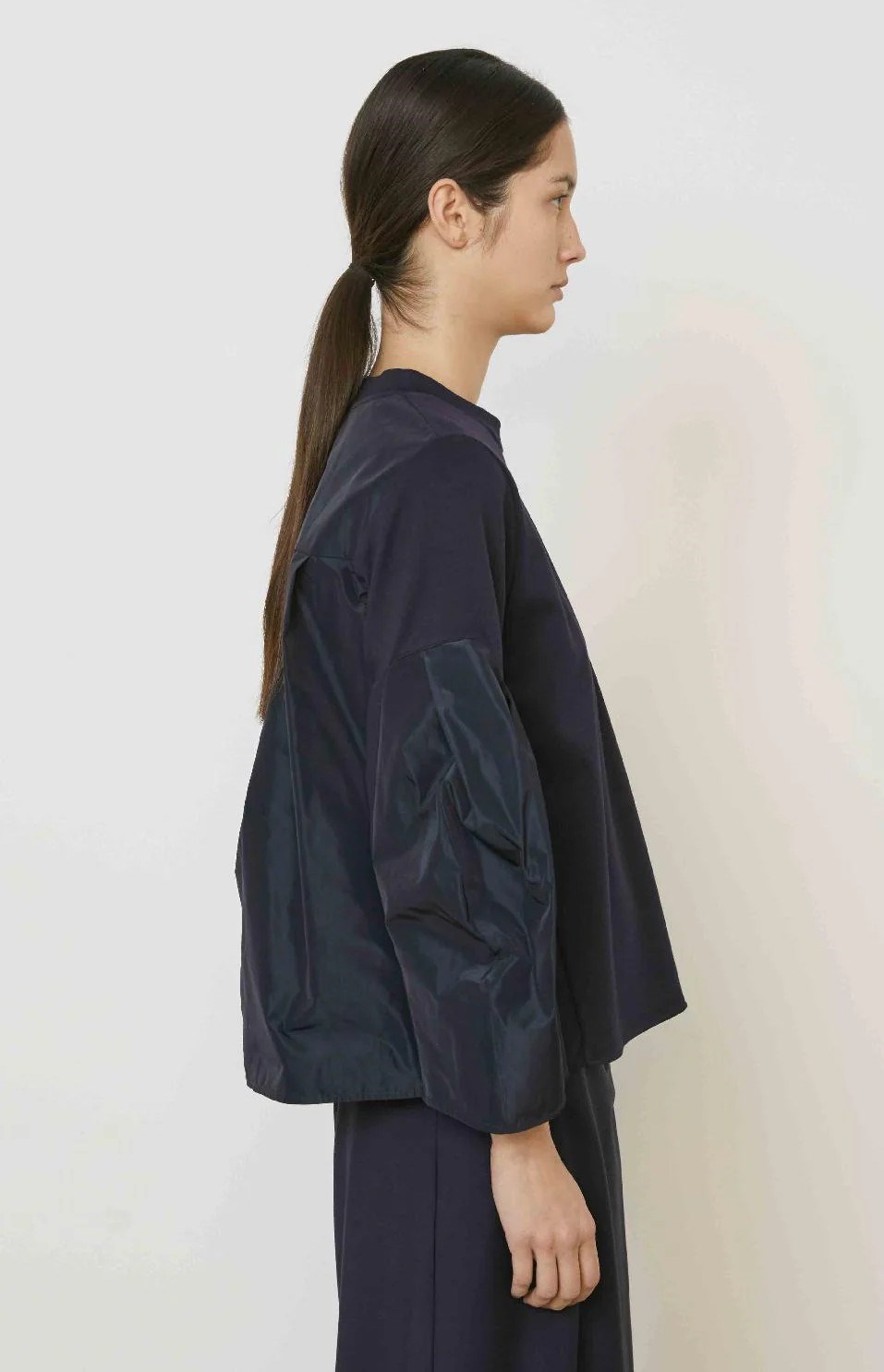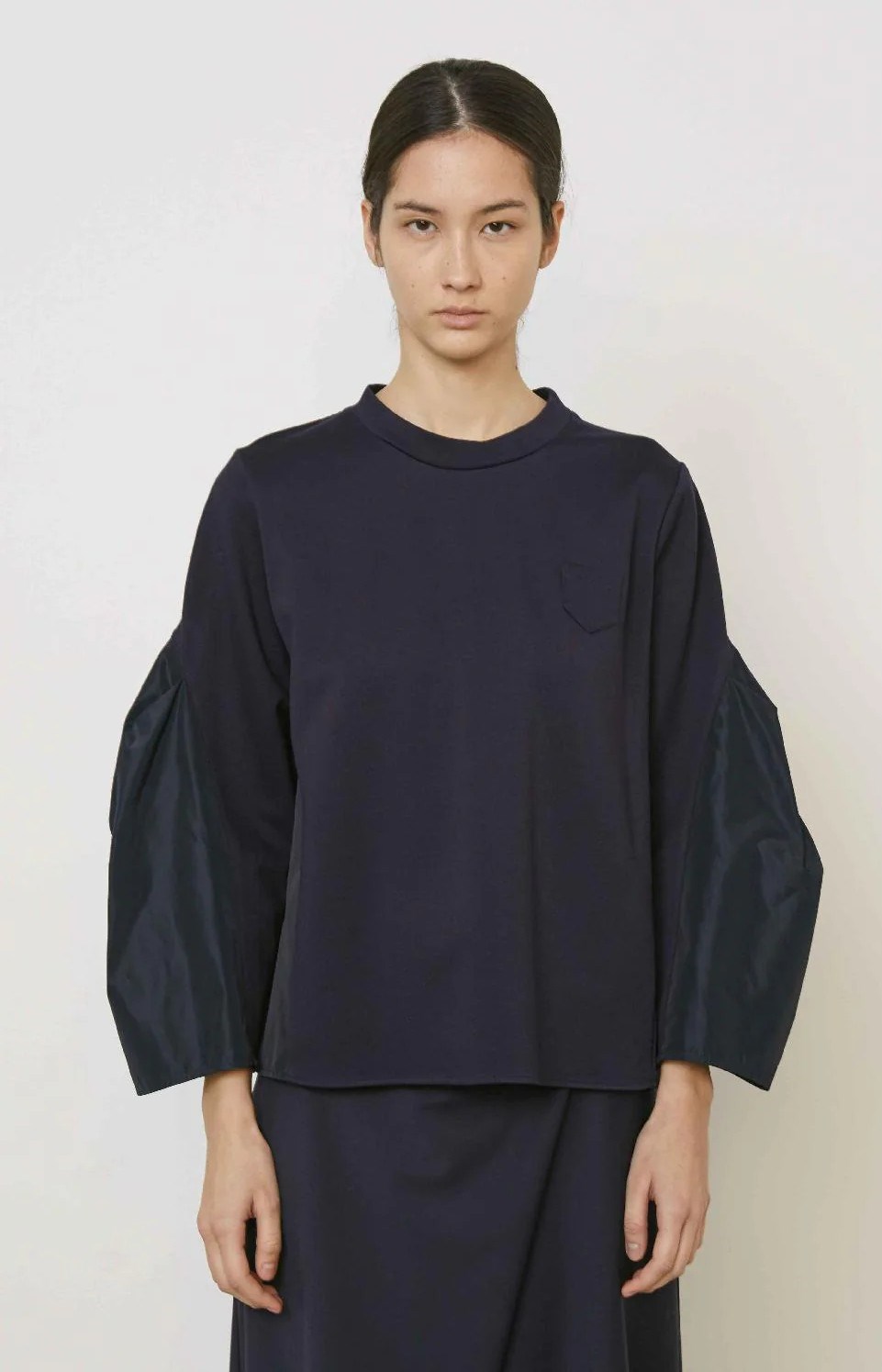 The BLOUSE is a long-sleeved, dark-colored garment. It features a boat-neck design and has voluminous sleeves that add a unique and stylish touch. The blouse appears to be made from a soft, flowing fabric that drapes elegantly. The overall design is minimalist and modern, making it suitable for both casual and formal occasions.