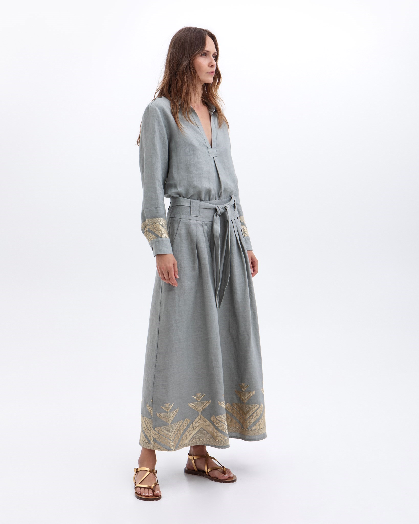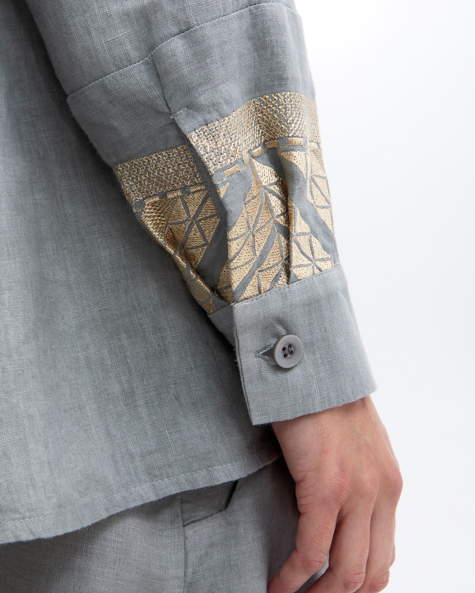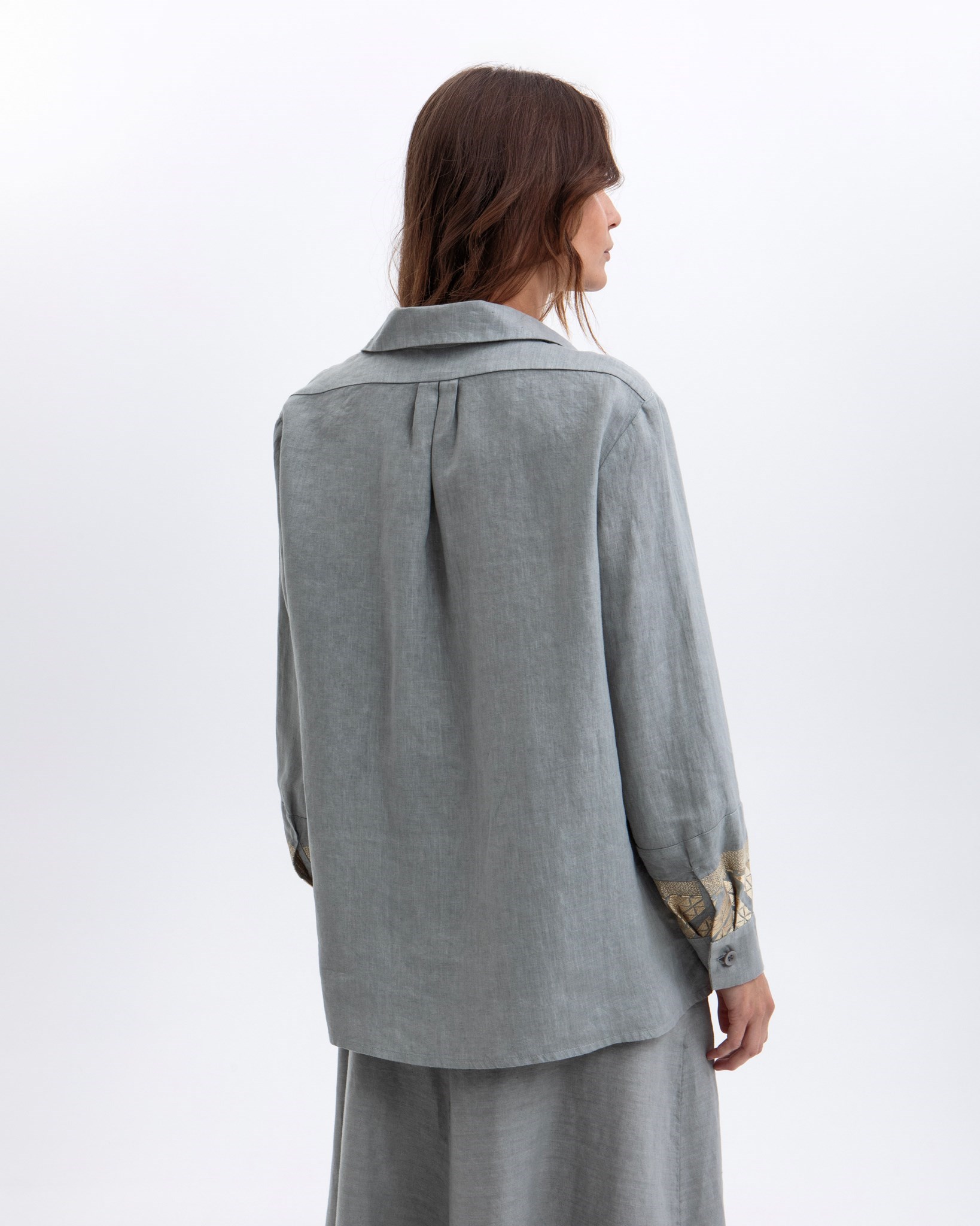 The BLOUSE PYRAMID  is a long-sleeved, loose-fitting top made from a light, textured fabric in a muted greyish-green tone. It features a collared neckline with a deep V-shaped opening and a central front pleat that adds subtle structure to the design. The sleeves are adorned with decorative gold-toned embroidered or printed bands near the cuffs, adding a touch of elegance. The hemline is straight, and the overall style is relaxed and comfortable, suitable for casual or semi-formal wear.