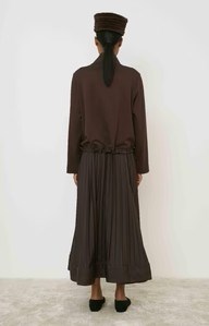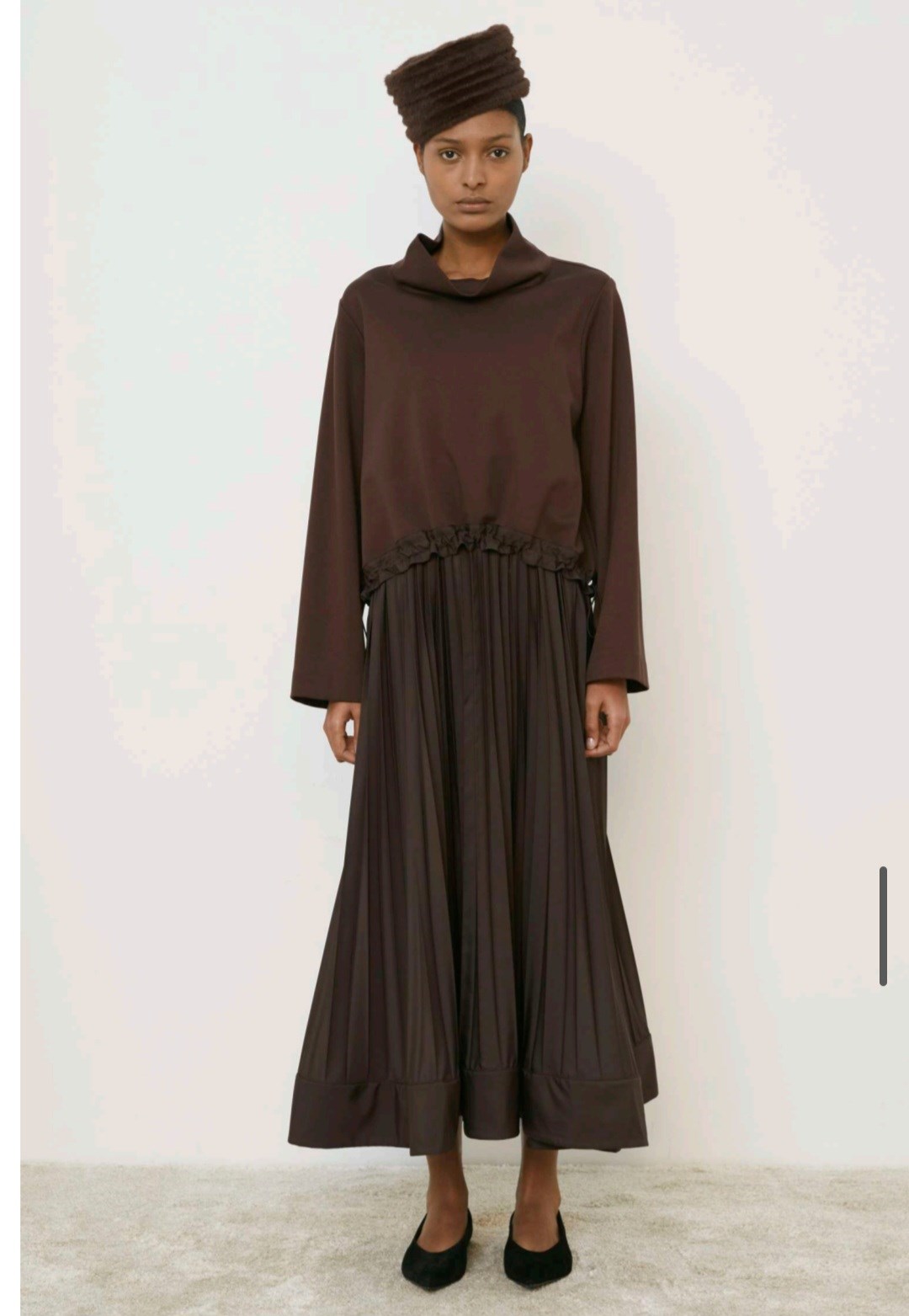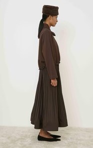 The DRESS is a long, flowing skirt that extends to the ankles. It has a pleated design, adding texture and movement to the garment. The dress is also made from a similar fabric as the blouse, ensuring a cohesive look. The overall outfit is monochromatic, with both the blouse and dress in a deep brown color.