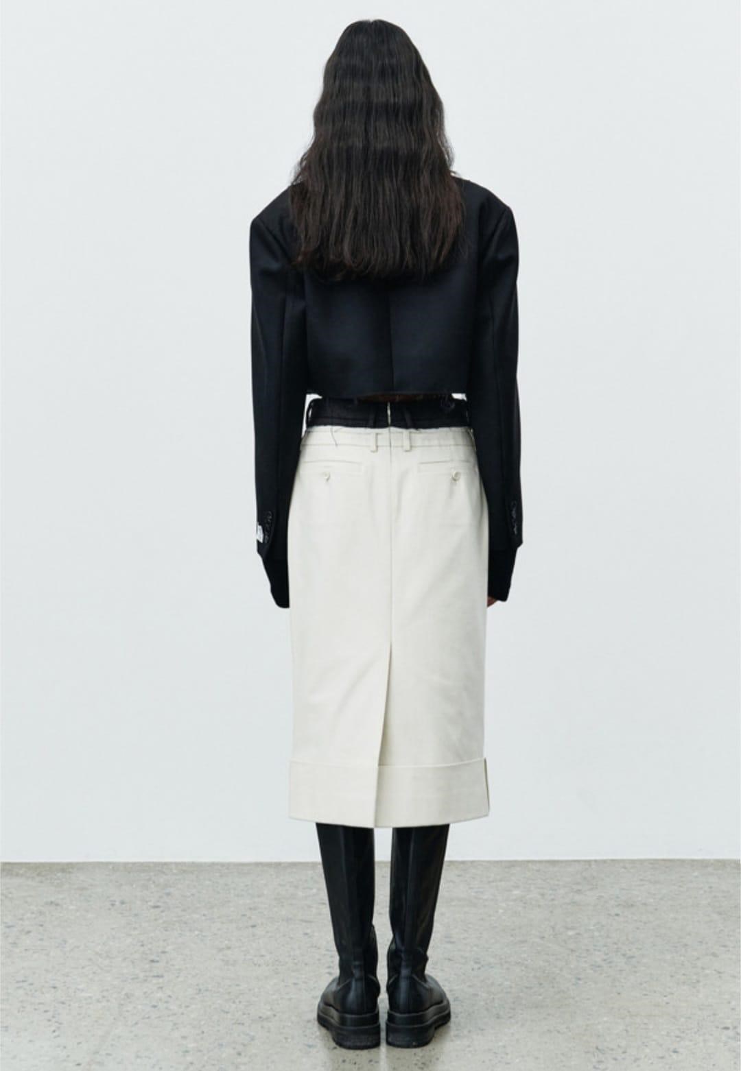 This features a cropped classic jacket. This jacket has a distinctive design with a shorter length that ends above the waist, giving it a modern and stylish look. It is paired with a high-waisted skirt, creating a fashionable ensemble. The jacket appears to be made of a dark fabric, possibly black, and has a structured fit with long sleeves. The cropped length allows for layering and can be worn over various tops, making it a versatile piece in any wardrobe.