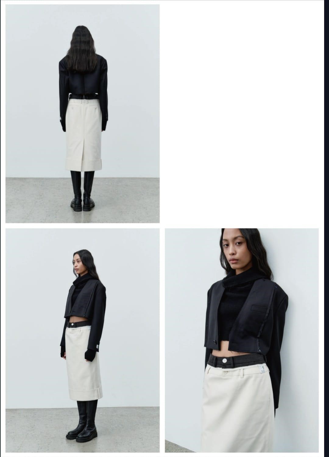 This features a cropped classic jacket. This jacket has a distinctive design with a shorter length that ends above the waist, giving it a modern and stylish look. It is paired with a high-waisted skirt, creating a fashionable ensemble. The jacket appears to be made of a dark fabric, possibly black, and has a structured fit with long sleeves. The cropped length allows for layering and can be worn over various tops, making it a versatile piece in any wardrobe.