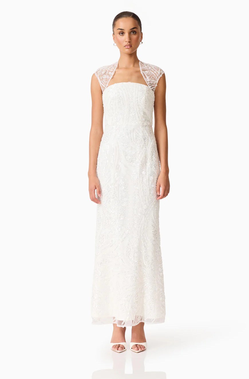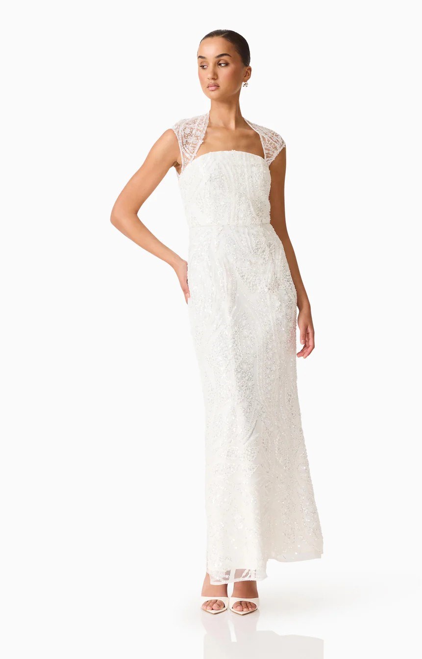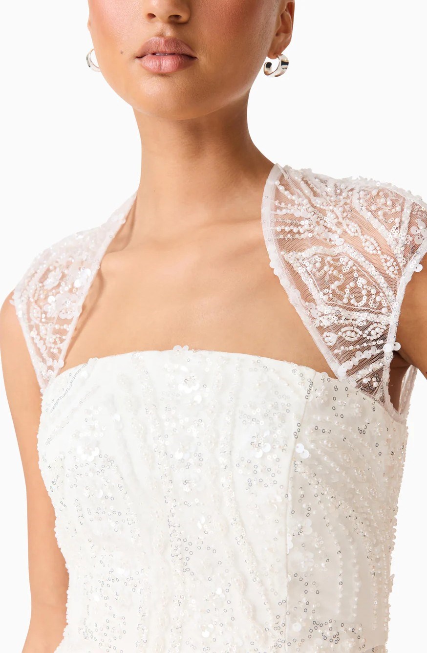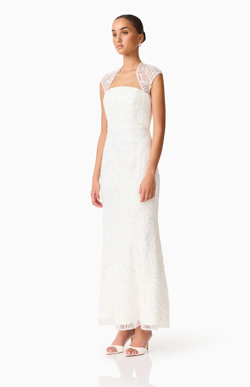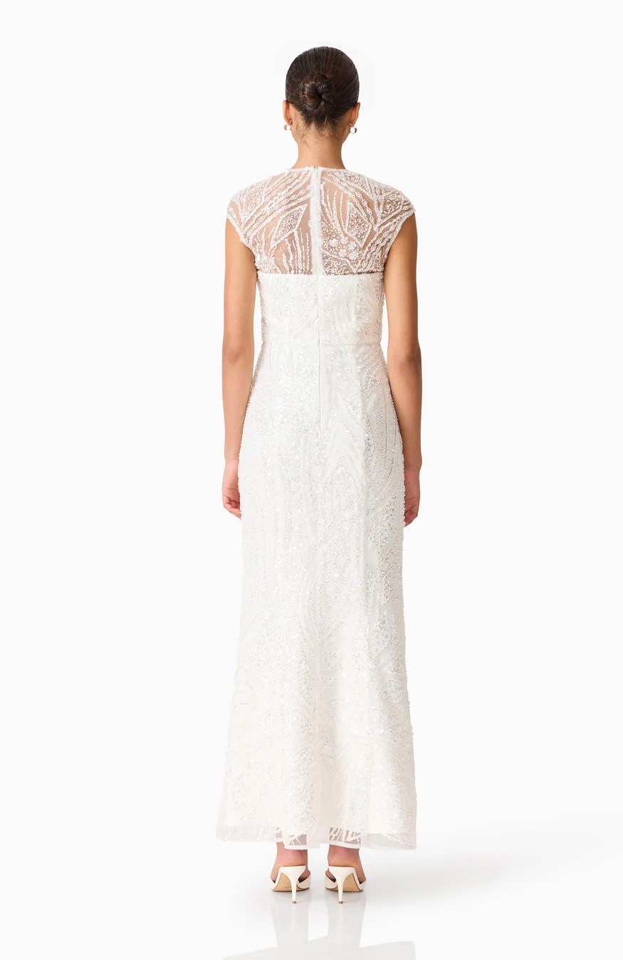 The Daelia Embellished Gown White is designed for moments that call for refined elegance. Crafted from delicate beaded mesh fabrication, this white gown blends timeless sophistication with intricate detail. The curved shaped neckline softly frames the décolletage, while cap sleeves add a feminine, balanced finish to the overall design.
