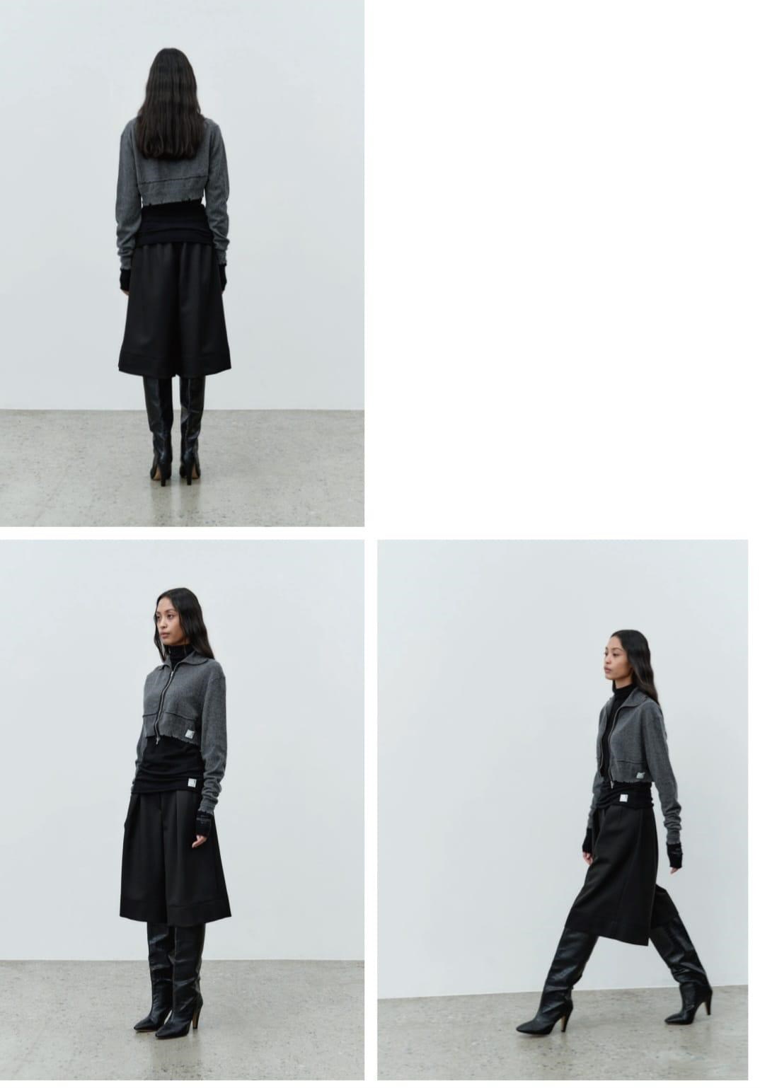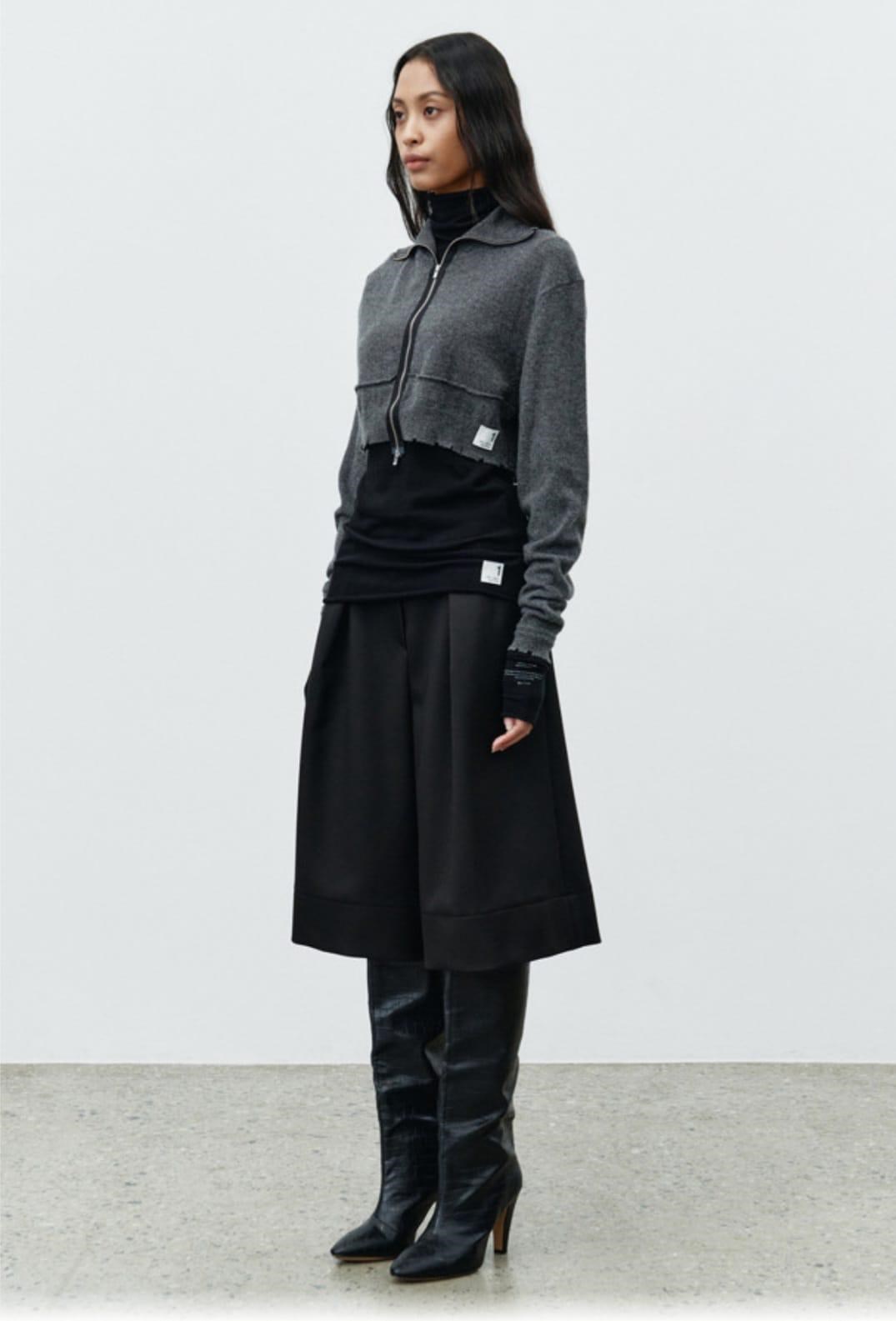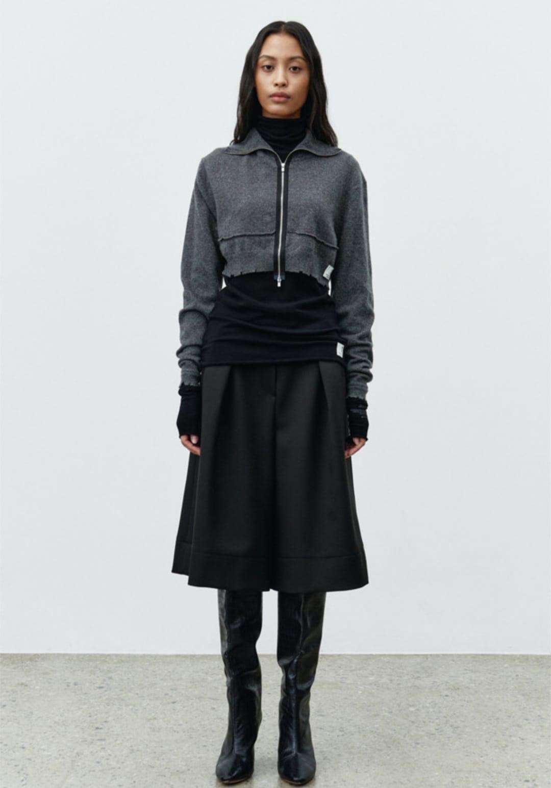 The destroyed cashmere knit zip-up sweater. This type of garment typically features a distressed or intentionally worn-out look, giving it a unique and edgy appearance. The sweater in the image is cropped, with a raw hemline and frayed edges, which are characteristic of the "destroyed" style. It has a zip-up front and is made from cashmere, a luxurious and soft material known for its warmth and comfort. The color of the sweater is a neutral gray, making it versatile and easy to pair with various outfits.