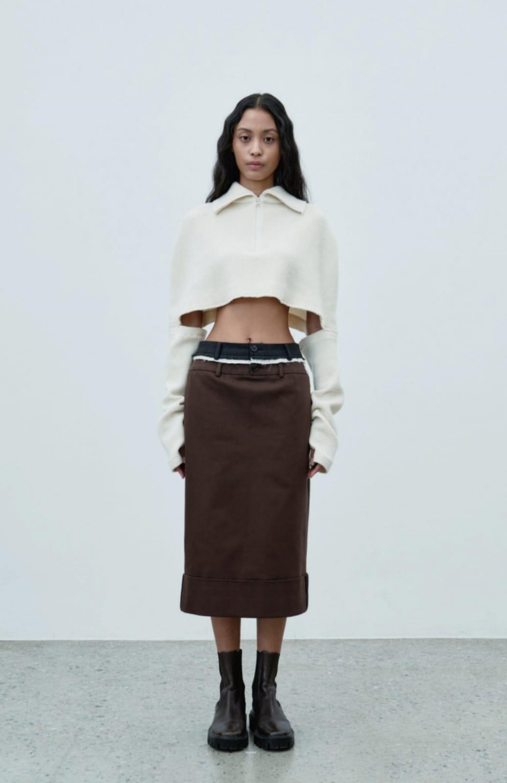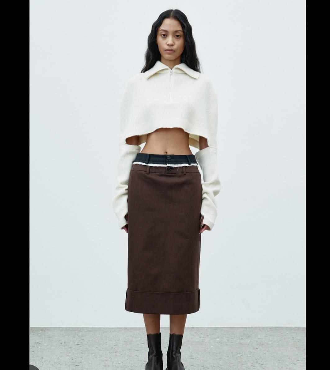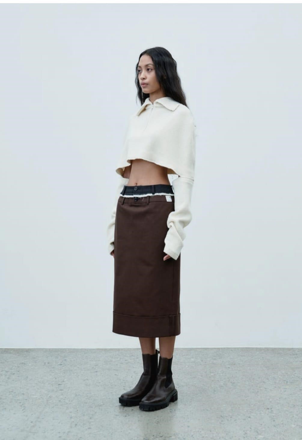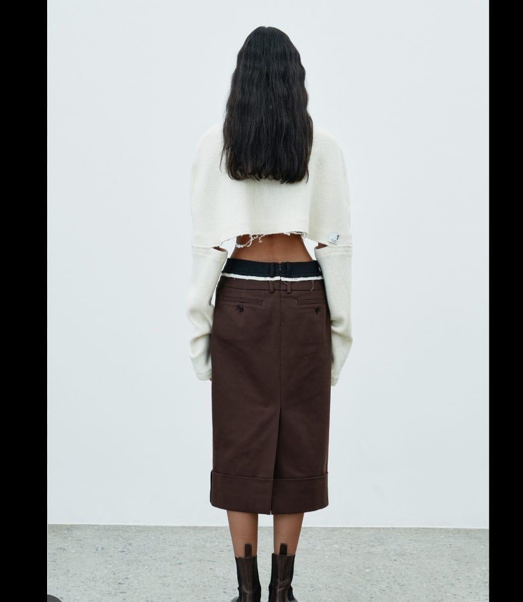 The double waist skirt, which is a distinctive fashion piece. This skirt has two waistbands, creating a layered look. The outer layer is a brown midi skirt that extends below the knees, while the inner layer appears to be a denim waistband, adding a contrasting texture and color. The skirt is paired with a cropped sweater and black boots, completing a modern and stylish outfit.
