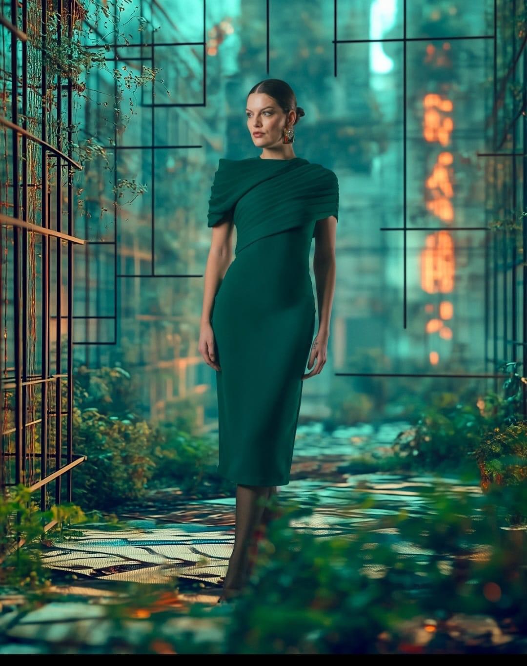 DRAPED PLEATED CAP SLEEVE SHEATH DRESS colour in emerald green, knee-length dress with a unique, asymmetrical design. The dress features a draped, layered fabric on the upper part, creating an elegant and sophisticated look. The person is standing in a futuristic or artistic setting, with a pathway surrounded by greenery and metal structures. The background includes a mix of natural elements and geometric patterns, giving the scene a modern and slightly surreal atmosphere.