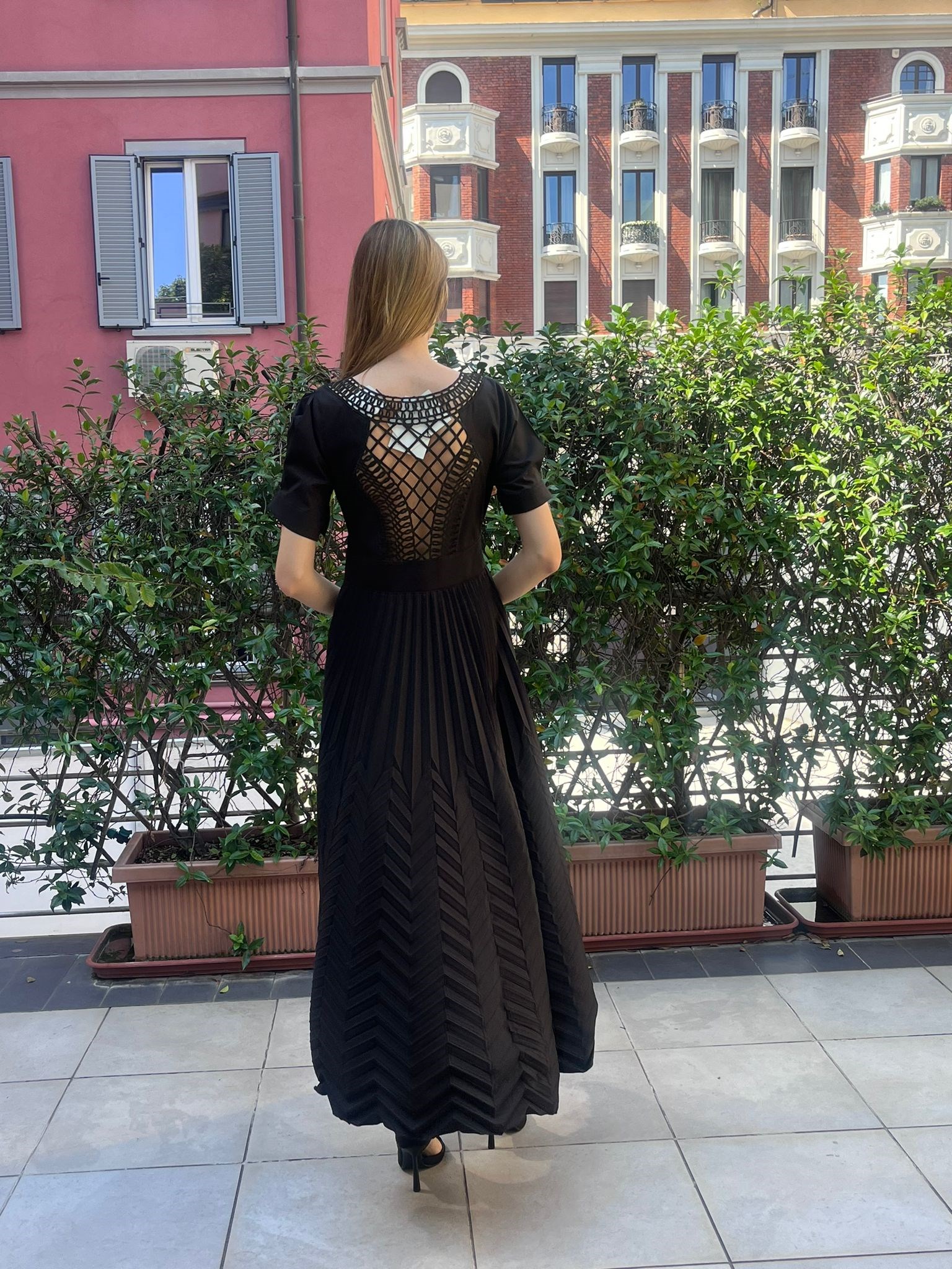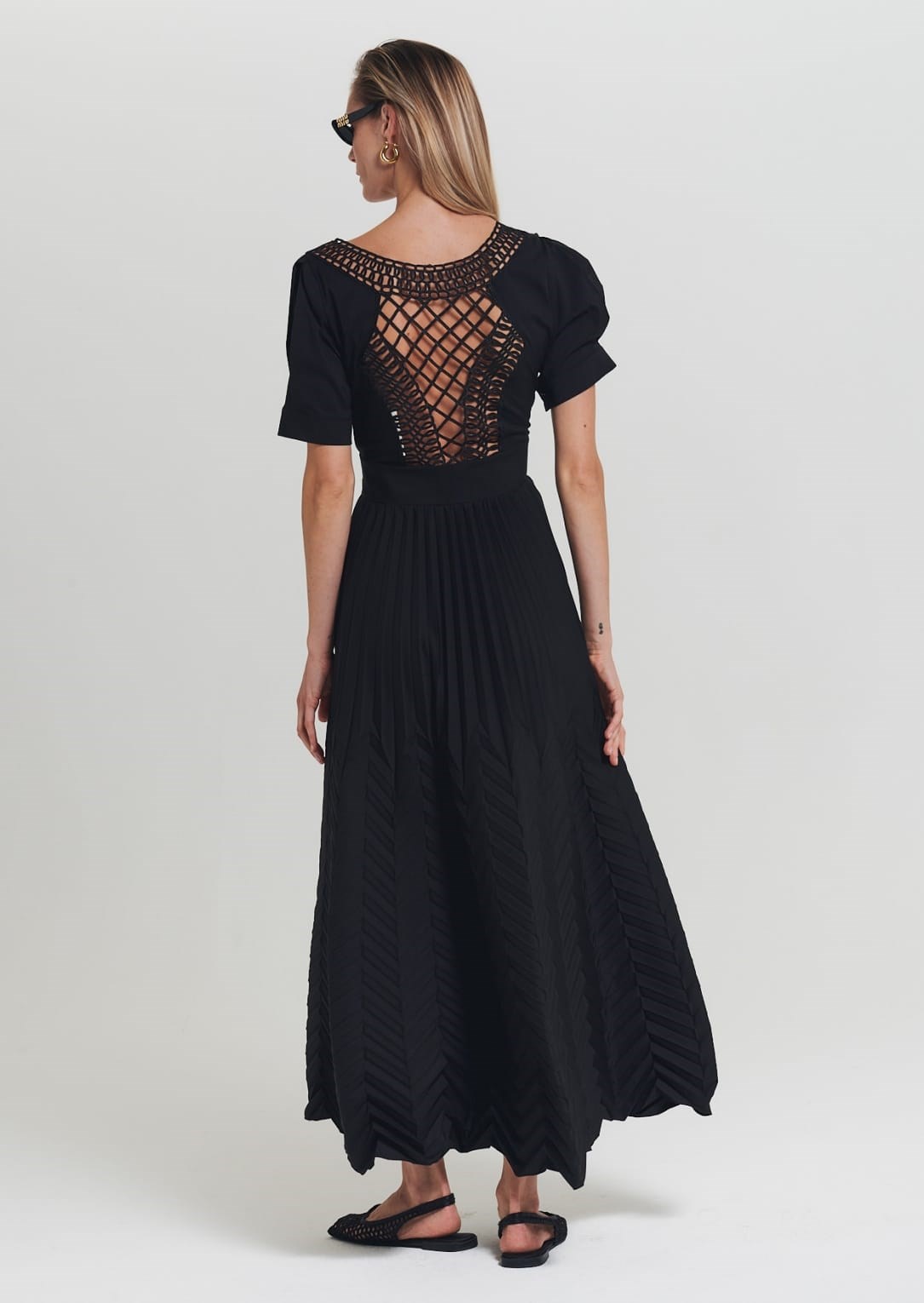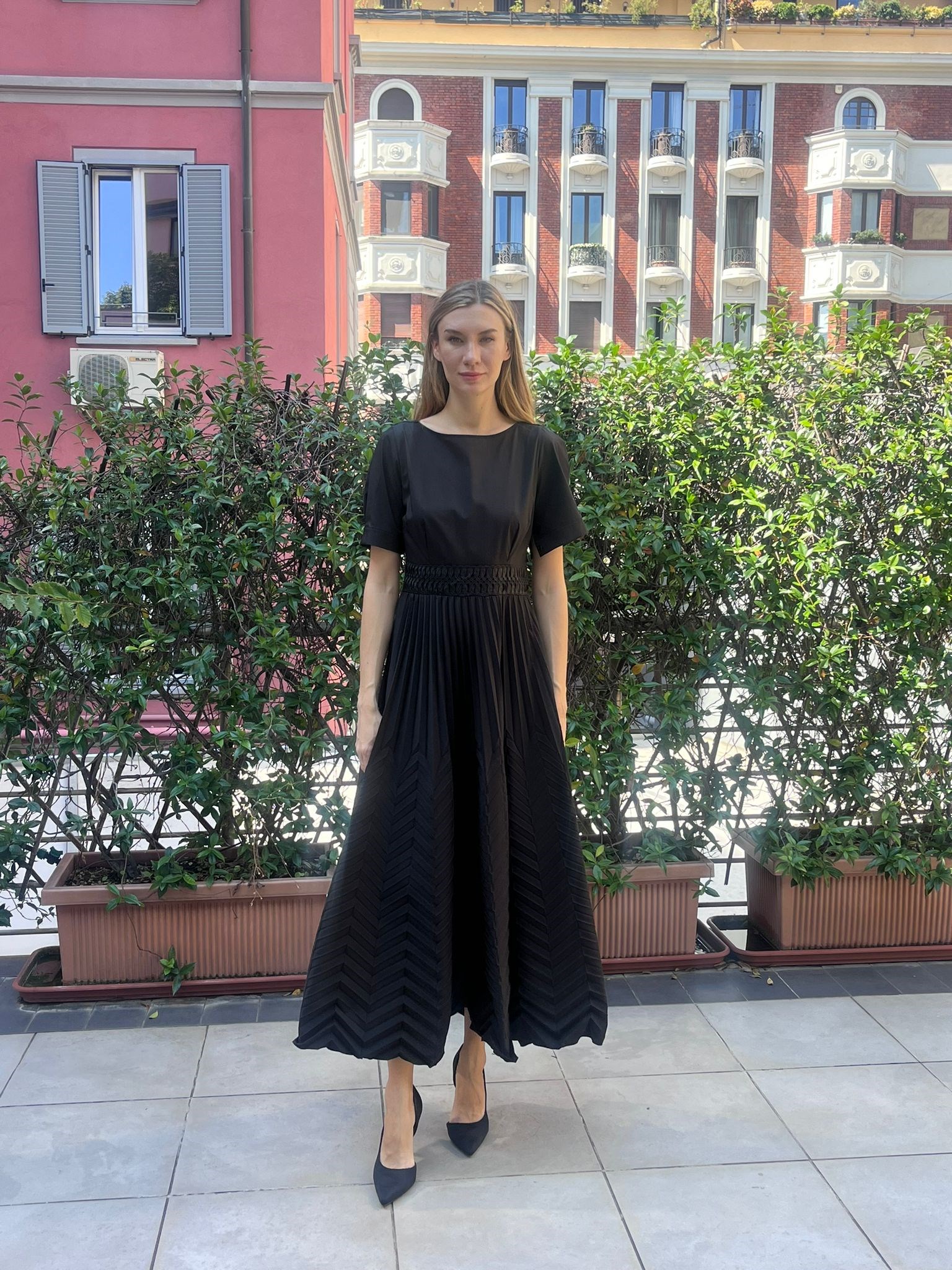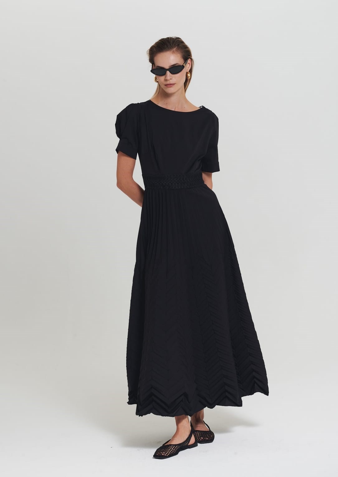 The Dress is a black maxi dress featuring a fitted bodice with short sleeves and a flowing skirt. The skirt has a chevron pattern created by the fabric's pleating or stitching, adding texture and visual interest. The dress length reaches the ankles, and it is paired with black pointed-toe heels, giving it a sleek and elegant look.