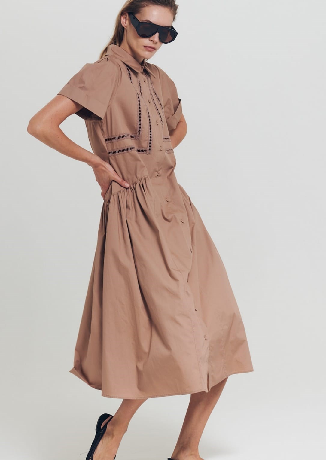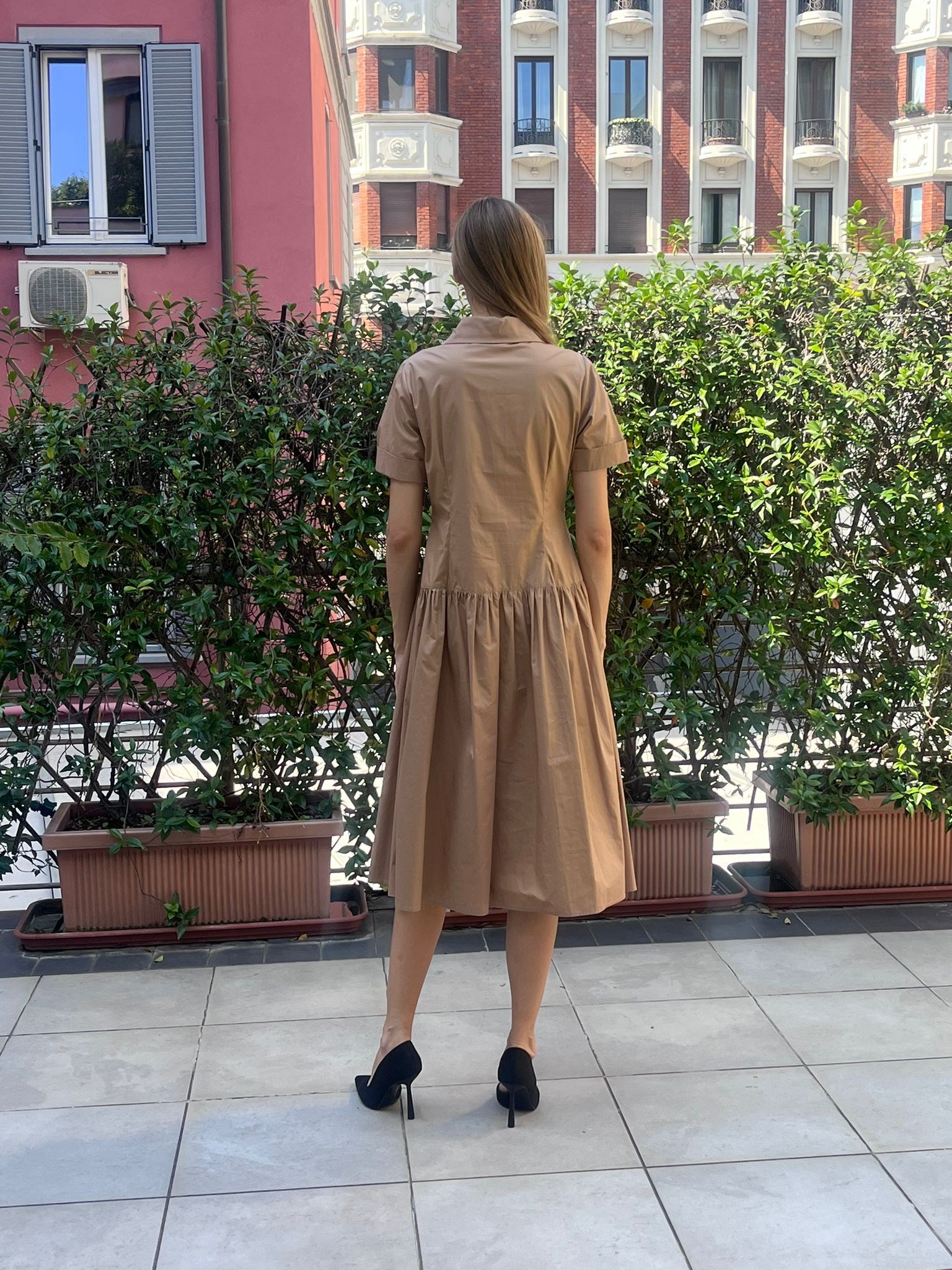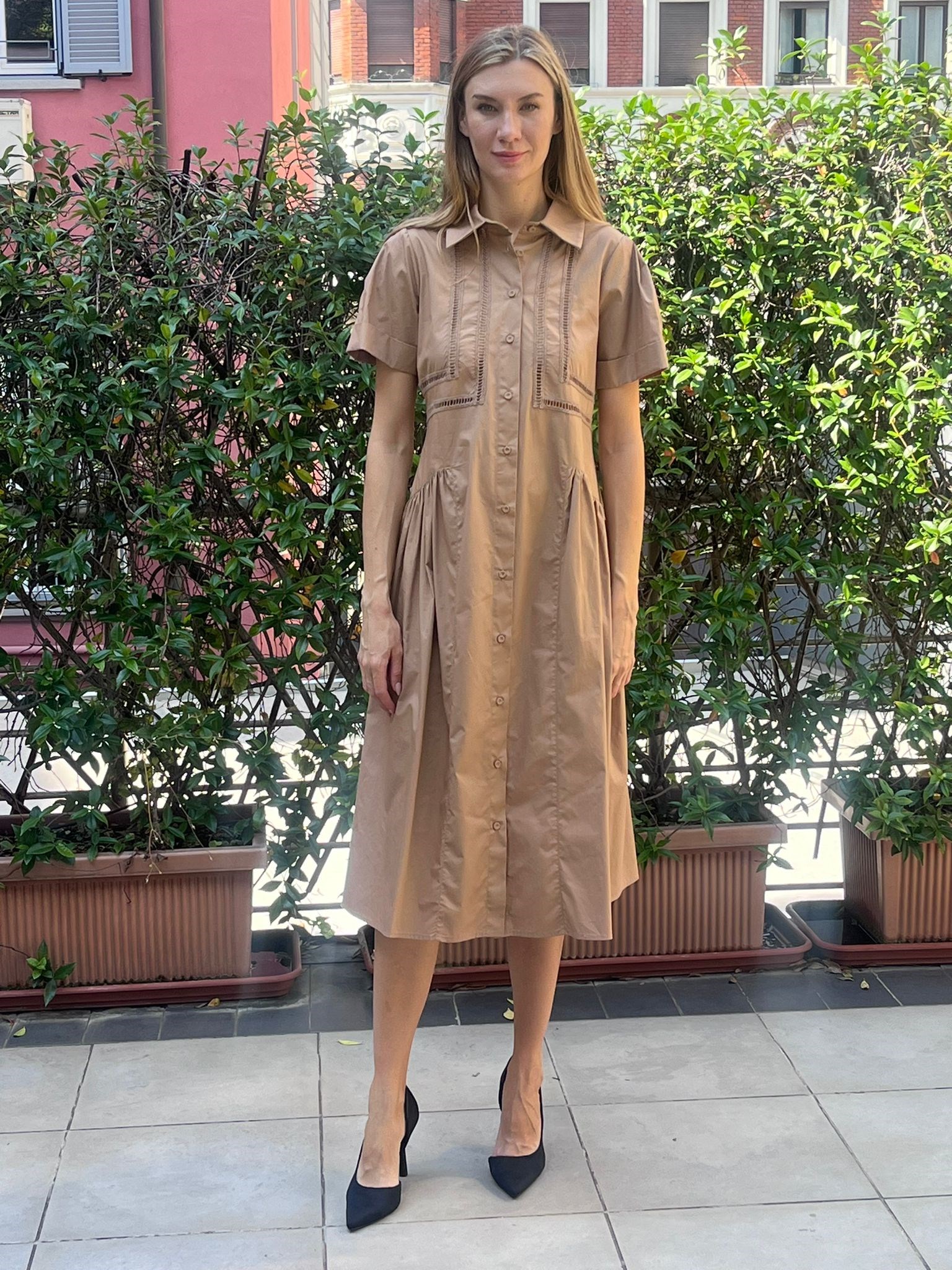 The Dress is a knee-to-mid-calf length shirt dress in a light beige/tan color. It features short sleeves and a classic shirt collar, giving it a structured yet casual look. The front has a full button-down closure from the collar to the hem, adding to its shirt-inspired design. Design details include subtle pleating at the waist for a slightly flared skirt shape, and stitching accents around the chest area for added texture. The fabric appears to be lightweight and smooth, suitable for warm weather. The outfit is paired with pointed-toe black high heels, which add a touch of elegance to the overall look.