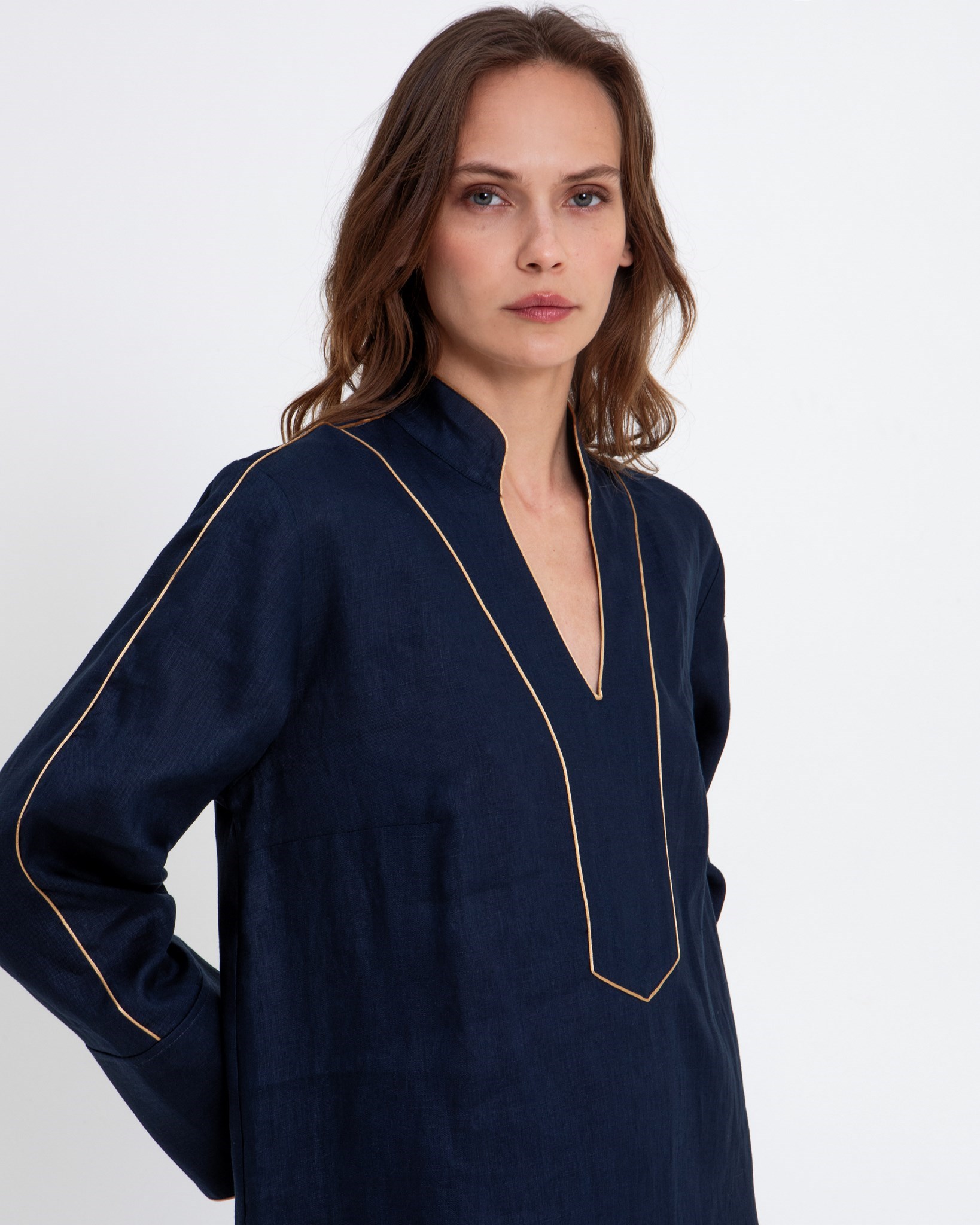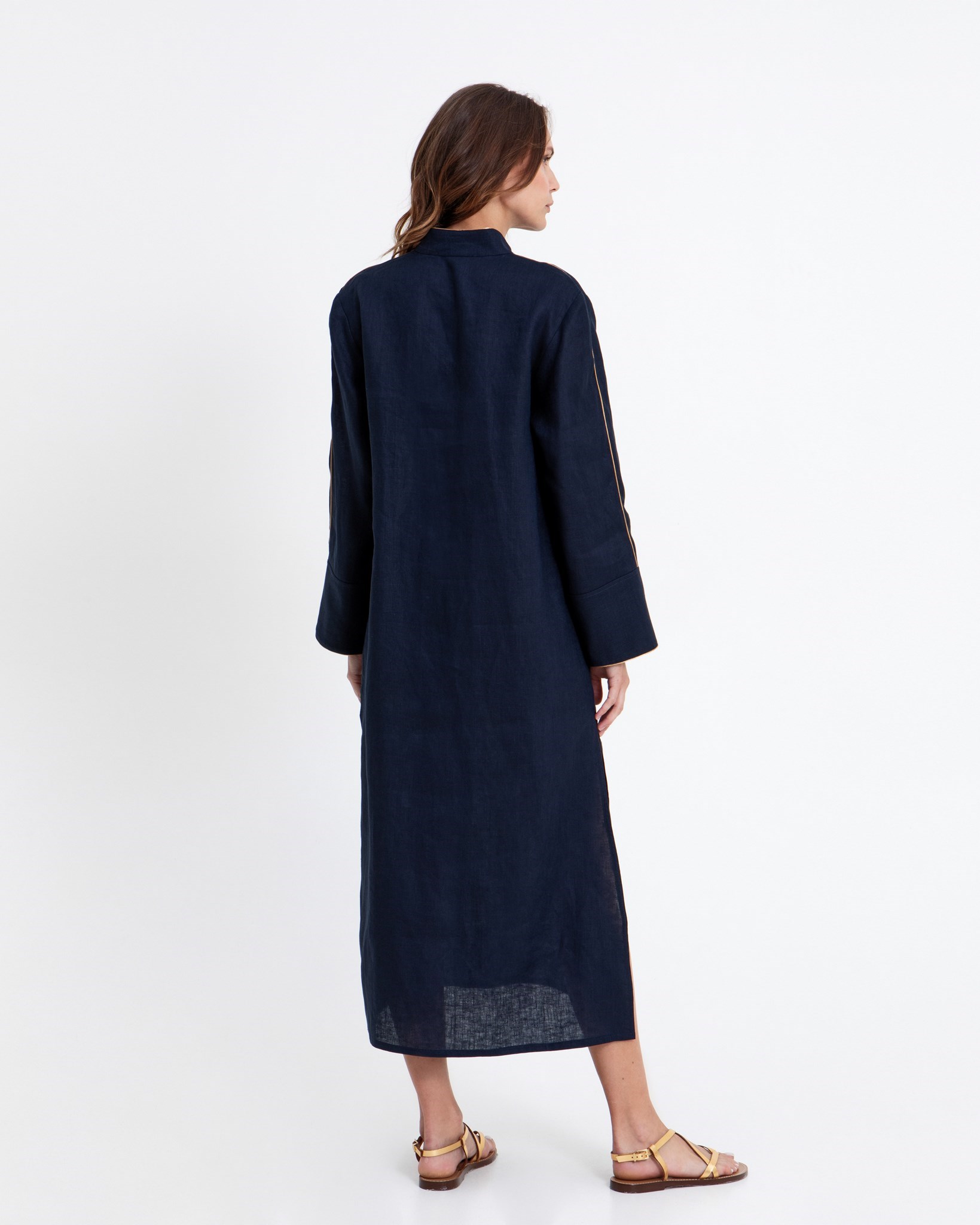 The fabric appears lightweight and breathable, suitable for warm weather. The dress is adorned with subtle embroidery along the neckline and sleeve seams, adding a refined decorative touch without overwhelming the minimalist design.