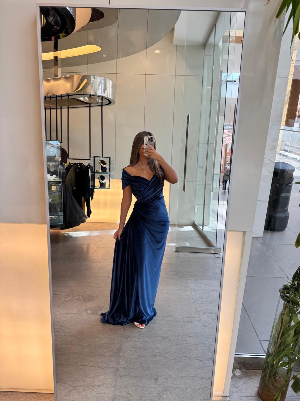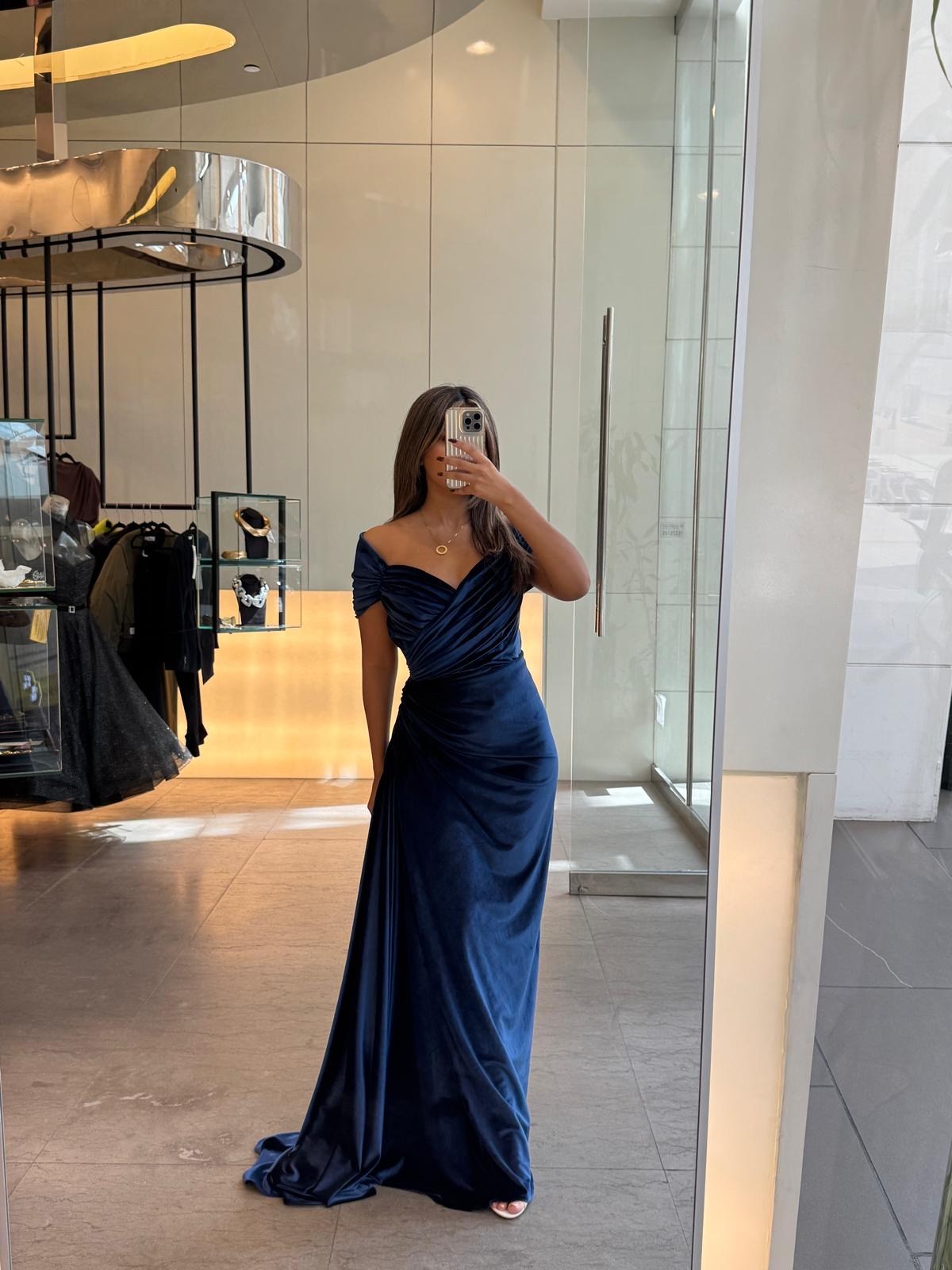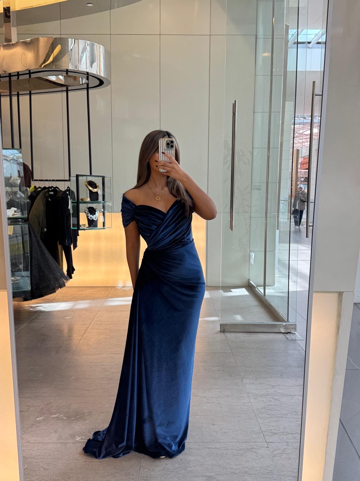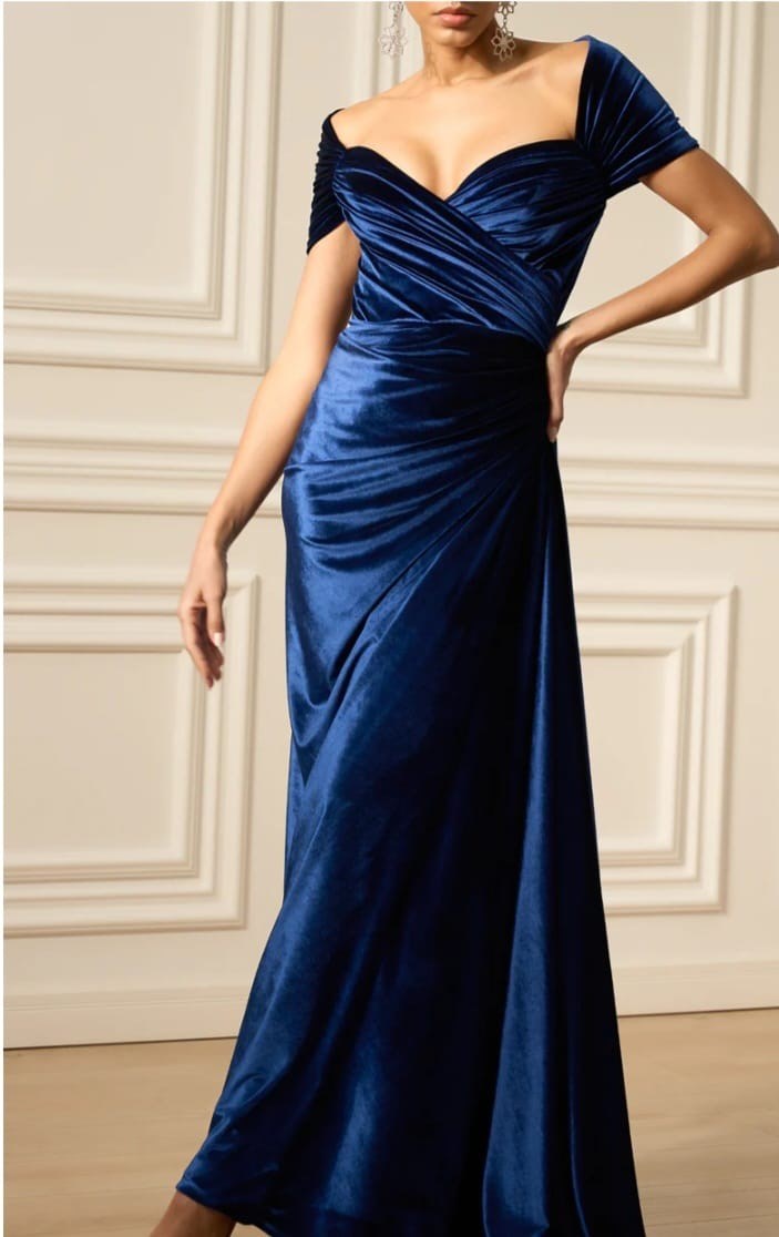 The image shows a woman wearing a blue velvet gown. The dress features an off-the-shoulder design with a sweetheart neckline. The bodice is ruched, creating a flattering and elegant look. The gown has a fitted waist and a draped skirt that falls gracefully to the floor. The fabric appears to be a luxurious velvet, giving the dress a rich and sophisticated appearance.