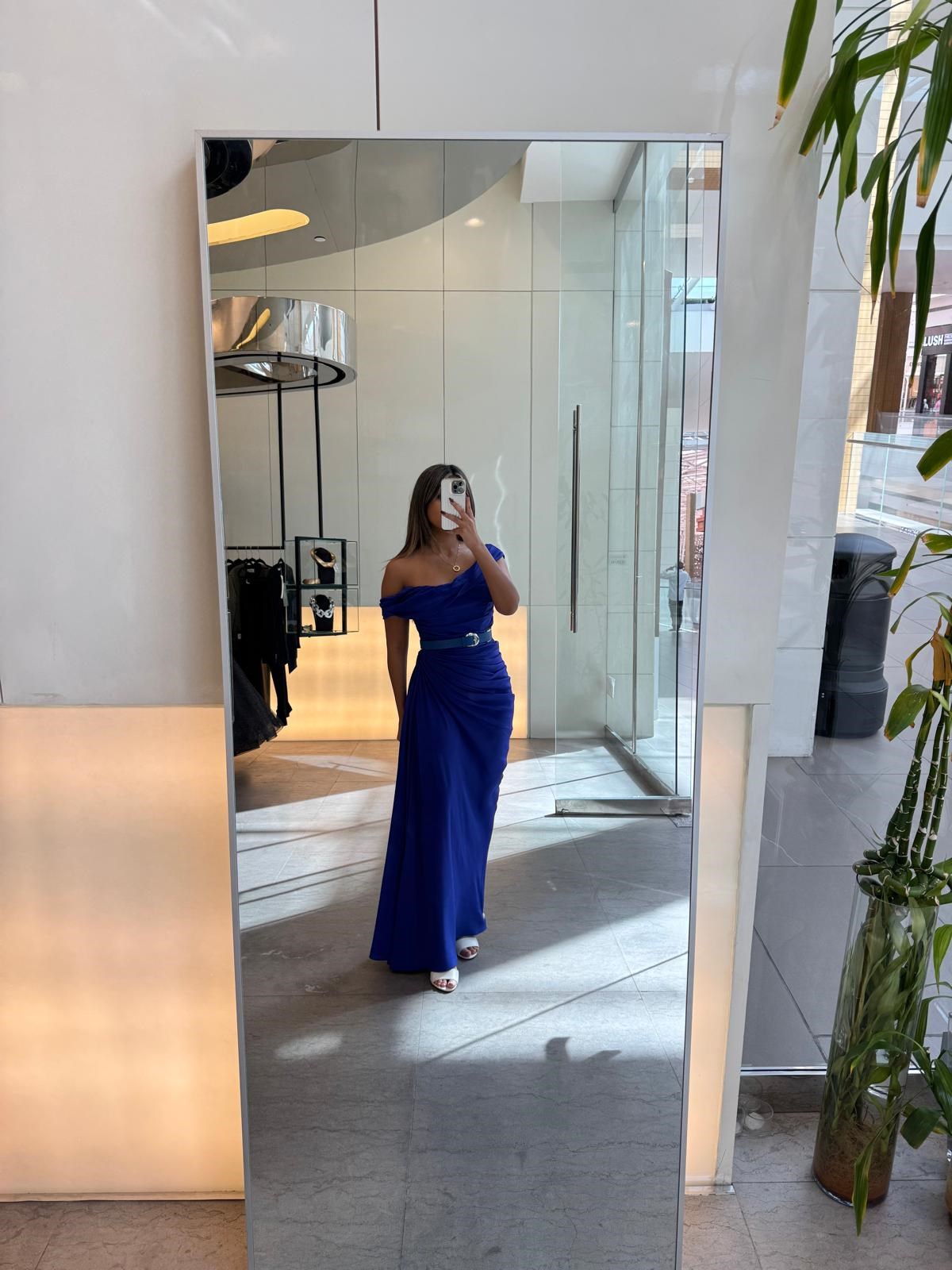 The blue velvet gown a ruched bodice that creates a flattering, wrapped effect. The fabric drapes elegantly down to the floor, giving the dress a sophisticated and luxurious appearance. The gown is fitted at the waist, accentuating the wearer's figure, and the rich blue colour adds to its elegance. The dress is suitable for formal events or special occasions.
