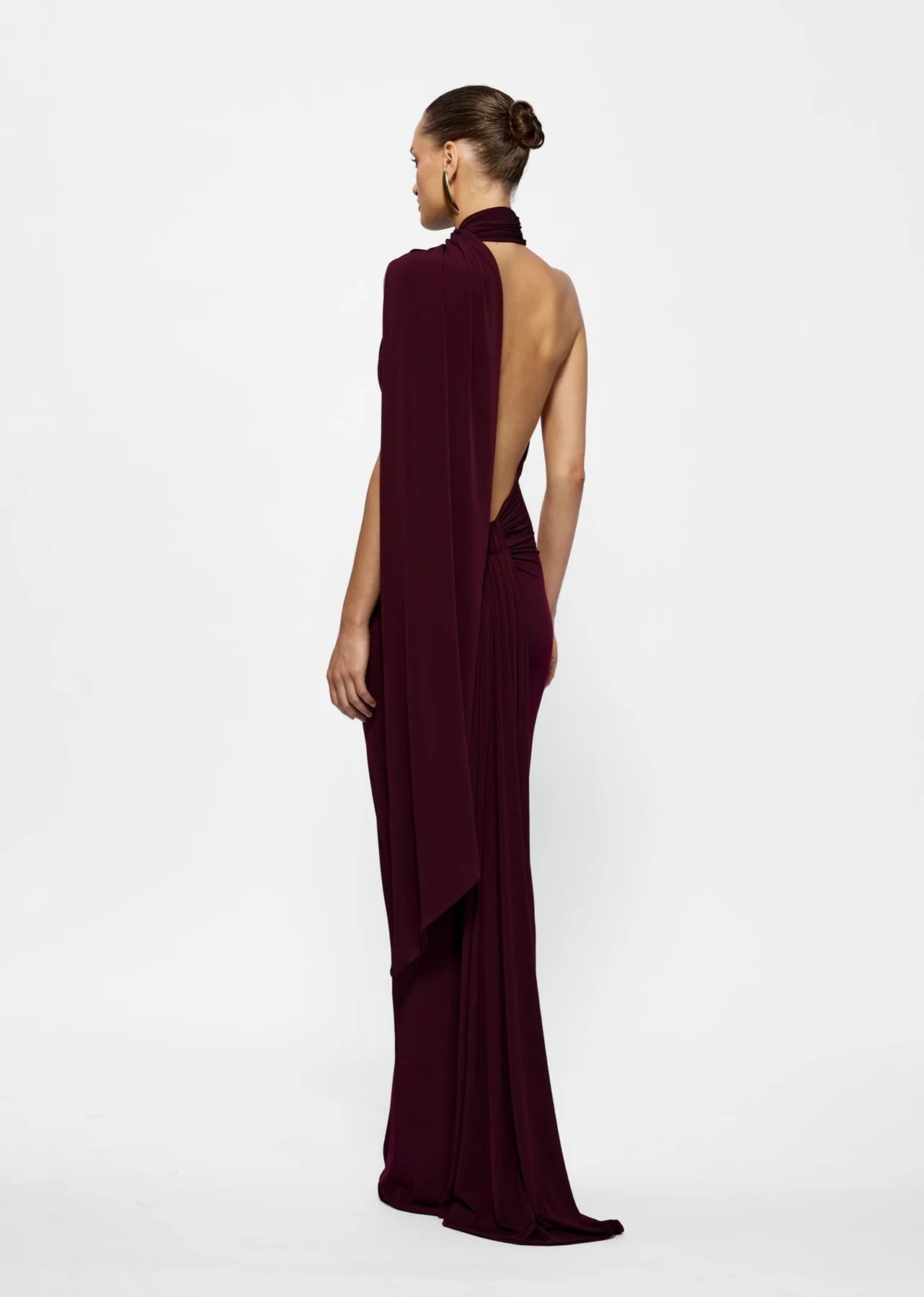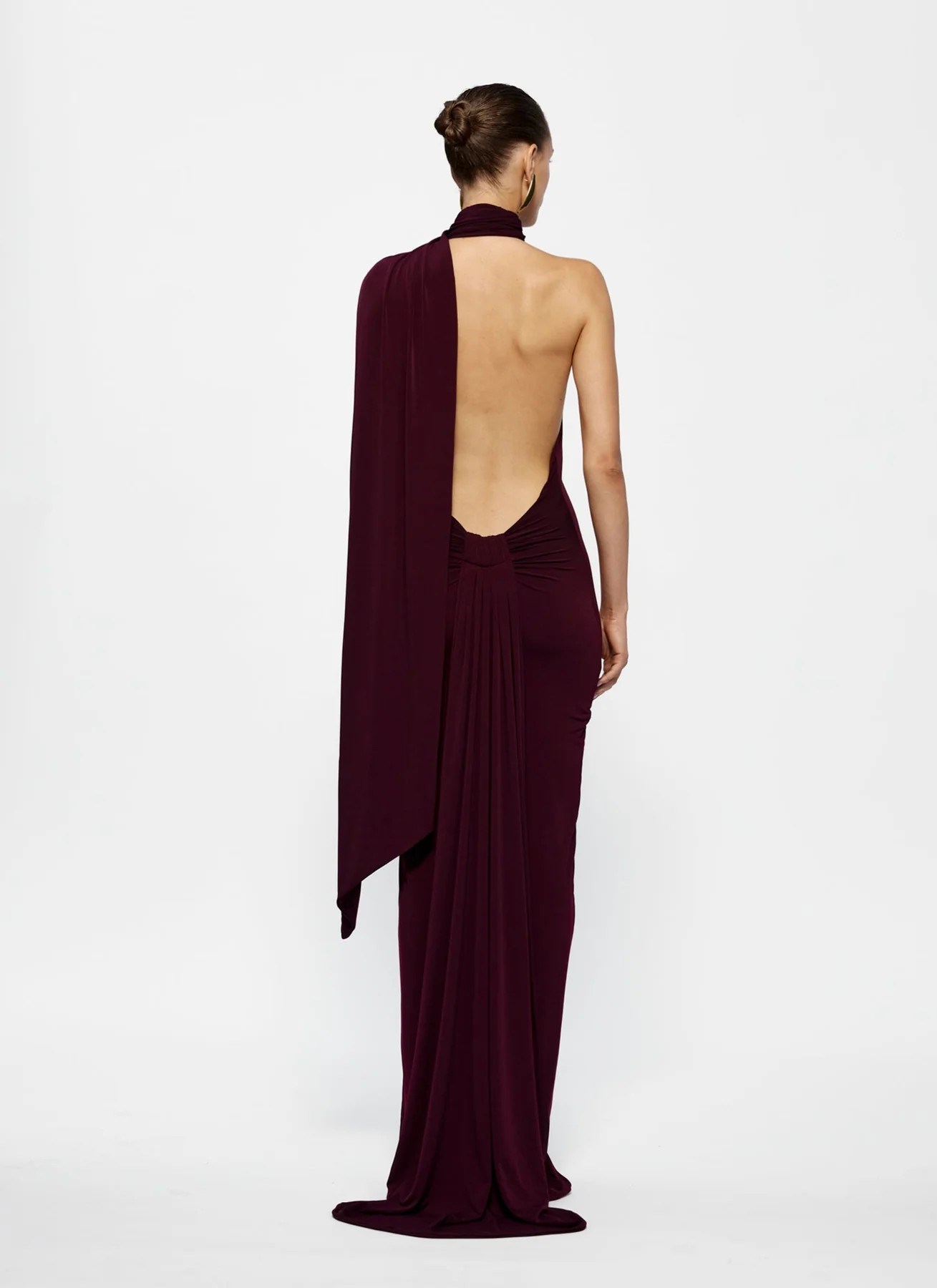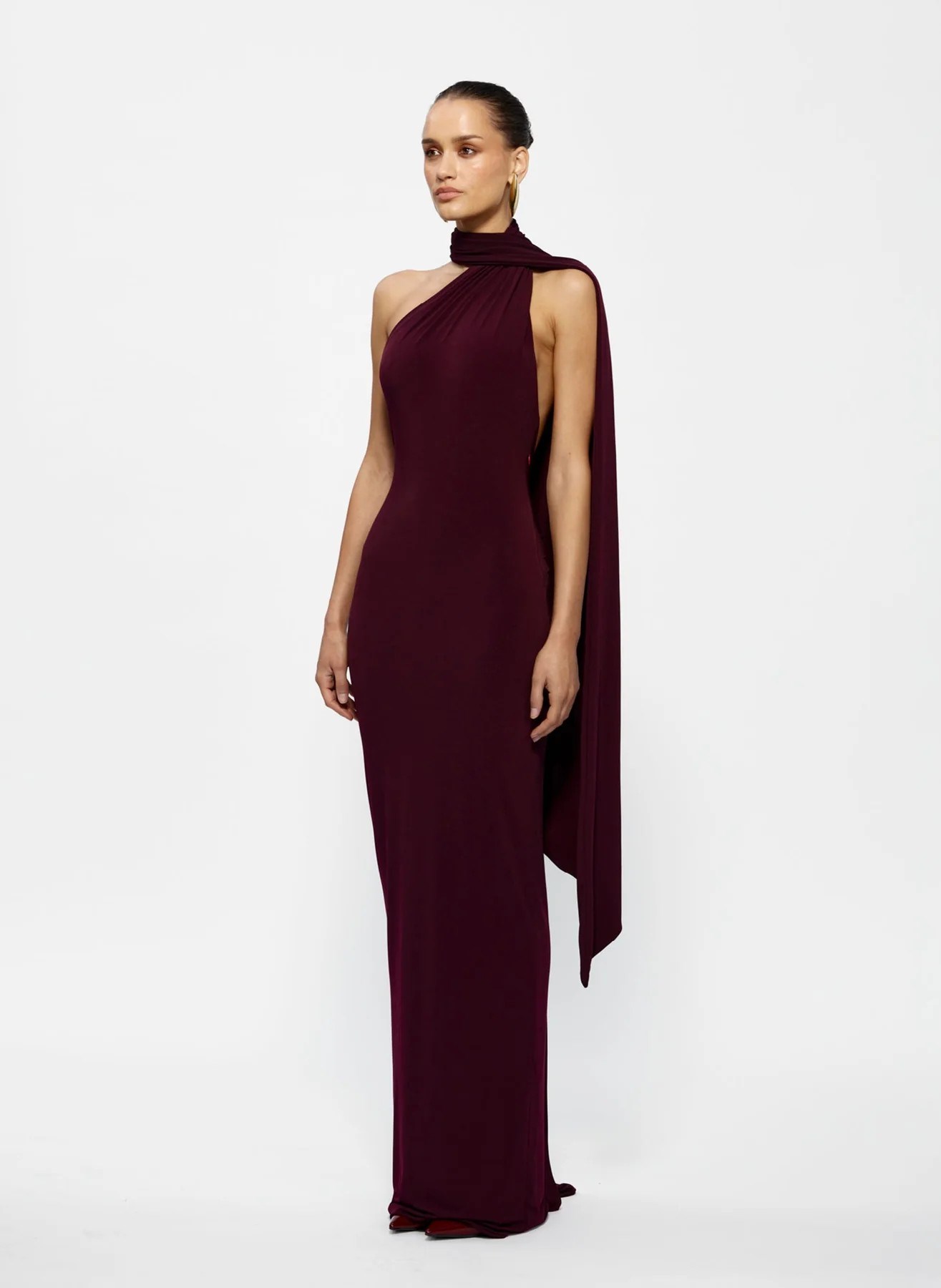 This HAVEN DRESS is a floor-length, form-fitting gown in a rich burgundy shade. It features a one-shoulder halter neckline with a stylish twist detail at the neck, creating an asymmetrical and modern look. From the neckline, a long, flowing cape drapes elegantly down the back, adding drama and sophistication. The gown’s sleek silhouette hugs the body, emphasizing a streamlined and elegant profile, making it ideal for formal events or red-carpet occasions.