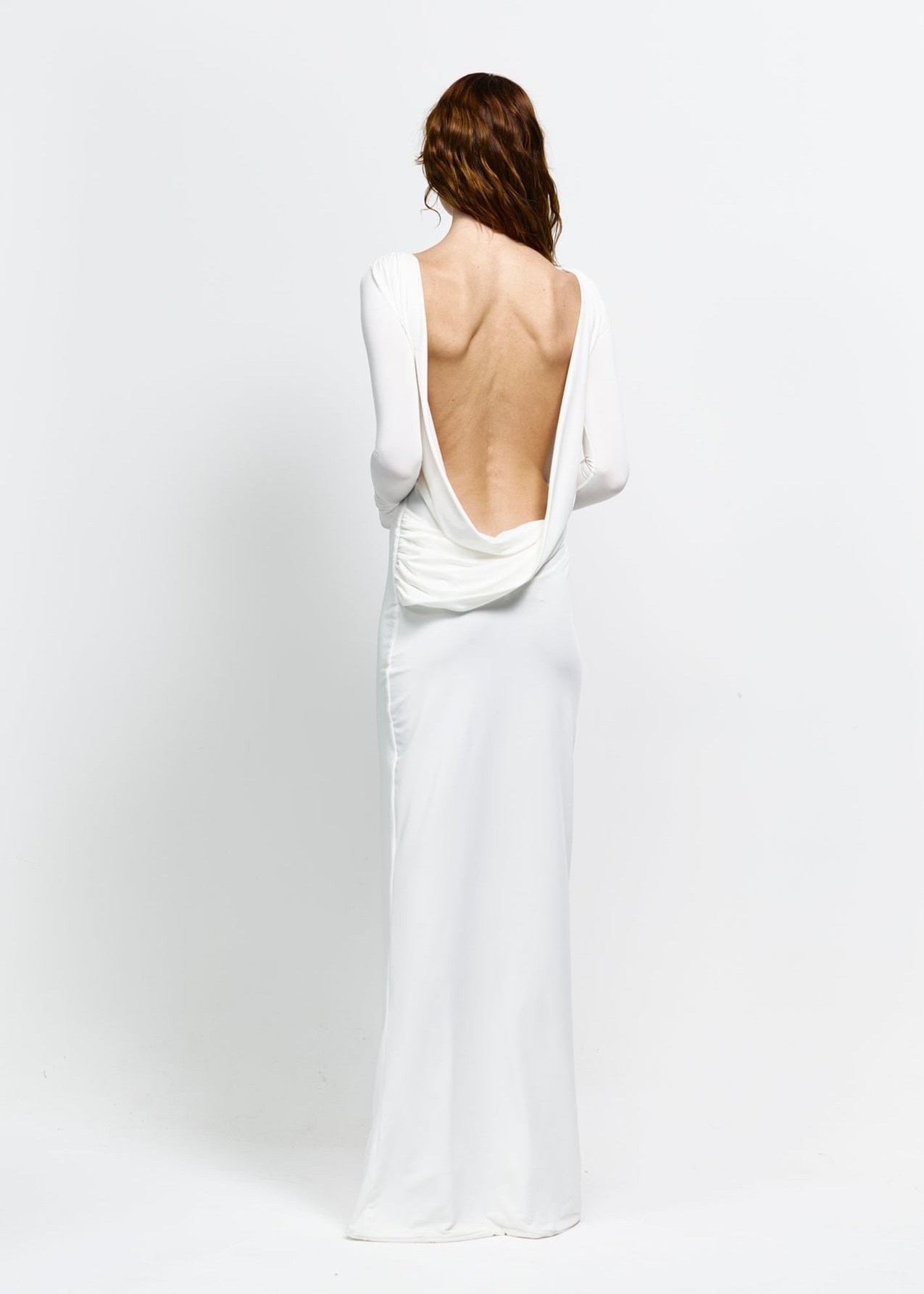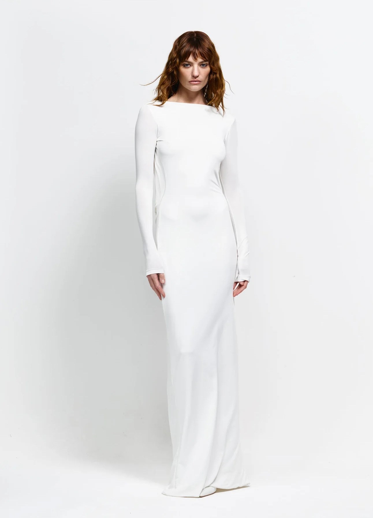 The dress is a full-length, form-fitting gown with a sleek and minimalist design. It features a high neckline and long fitted sleeves, creating a streamlined and elegant silhouette. The cut closely follows the body's natural shape, emphasizing a clean and modern aesthetic.