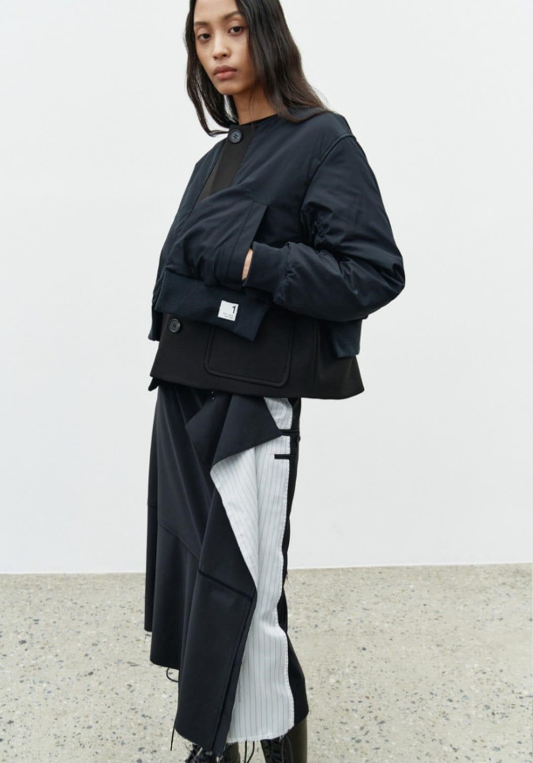 The Jacket detail flutted skirt, characterized by its unique shape and design. It has a layered look with a mix of black and white fabric. The skirt is long, reaching down to the boots, and has a flowing, asymmetrical hemline that adds movement and visual interest to the outfit. The fluted design creates a dynamic and modern silhouette.