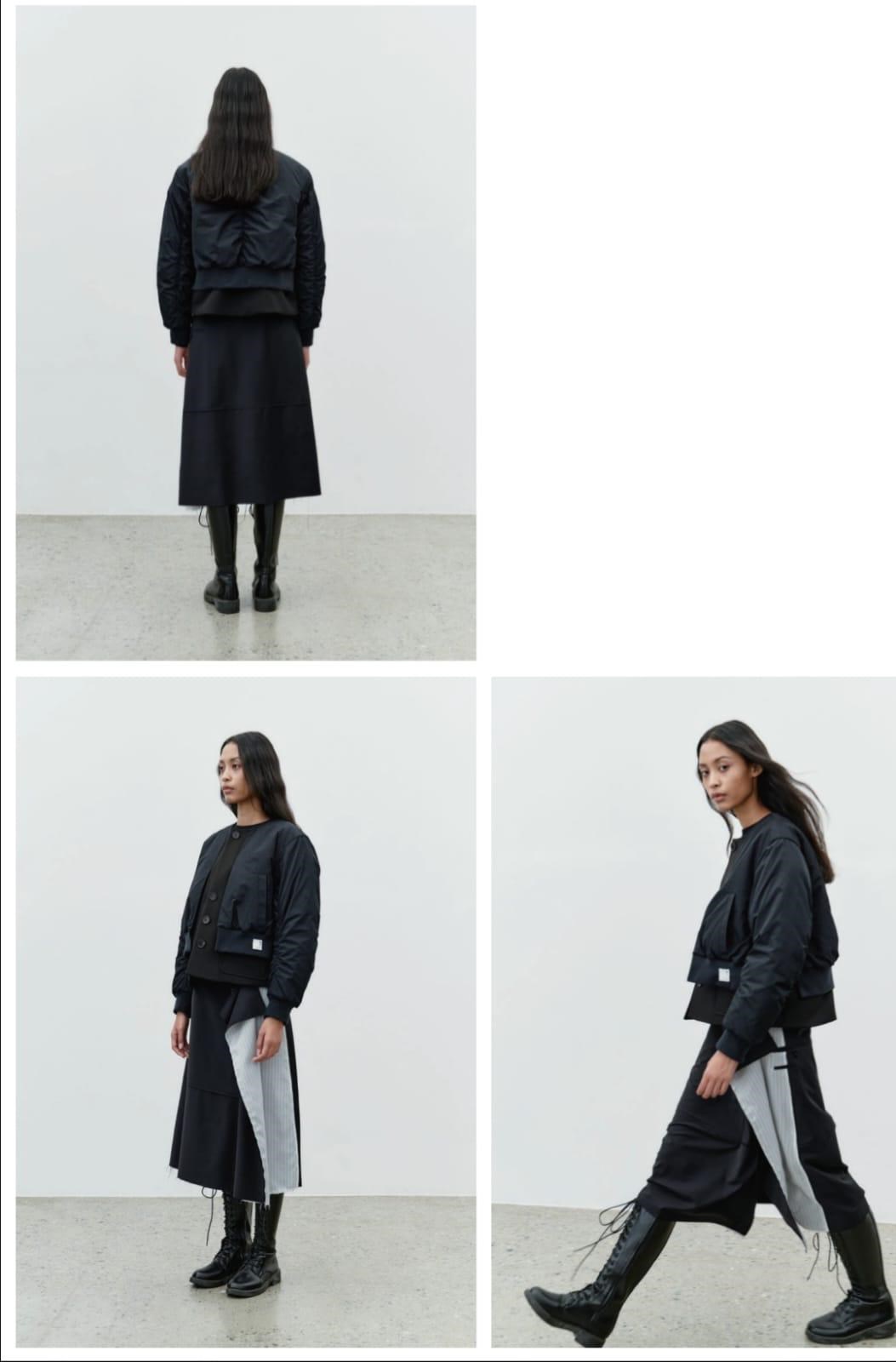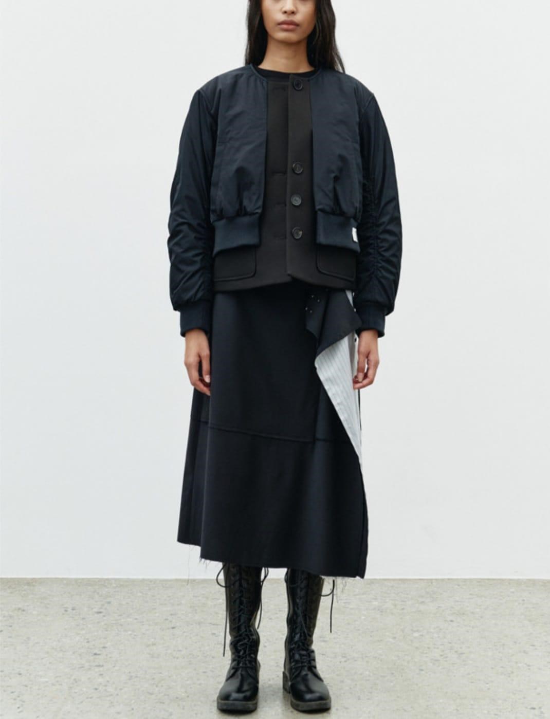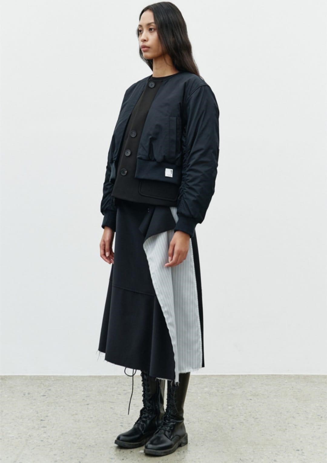 The MA1 layered quilted outer** garment. This piece features a combination of different materials and layers, creating a unique and stylish look. The outer layer appears to be a quilted jacket with a button closure at the top. The design includes multiple layers, with a mix of black and white fabrics, adding depth and texture to the outfit. The garment is likely designed for both warmth and fashion, making it suitable for cooler weather while maintaining a modern and edgy aesthetic.