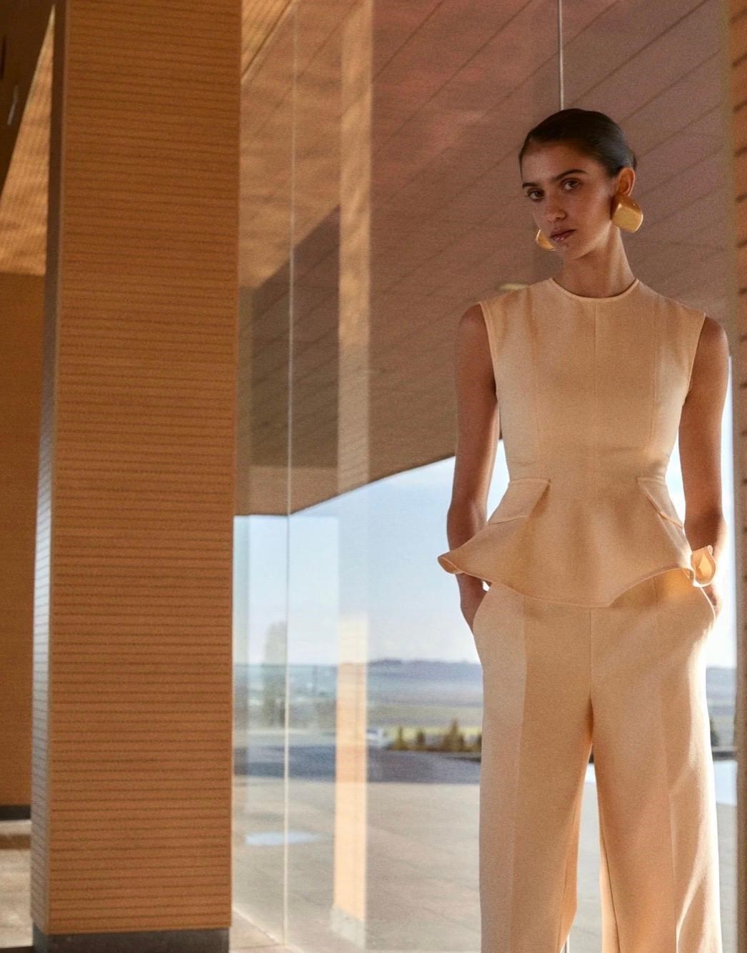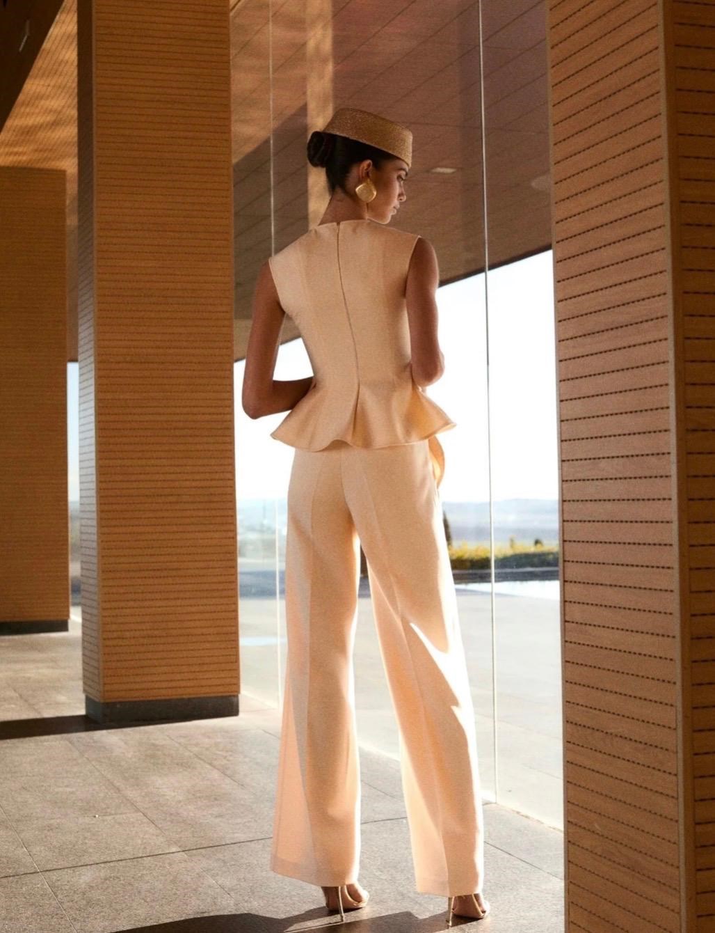 The top is paired with matching high-waisted trousers, creating a monochromatic, elongated silhouette. The overall look is sophisticated and modern, suitable for formal events, elegant daywear, or high-fashion occasions.