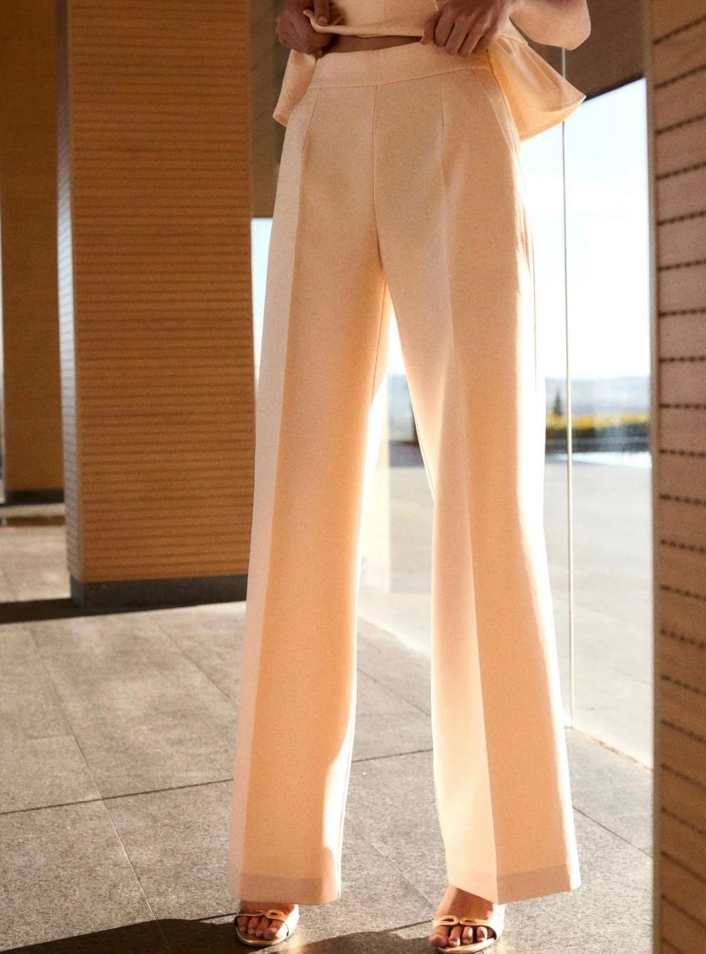 The pants are high-waisted and wide-legged, flowing down to the floor with a smooth drape. The cut elongates the legs and adds a formal, polished touch. The fabric appears to be lightweight yet structured, maintaining a crisp shape.