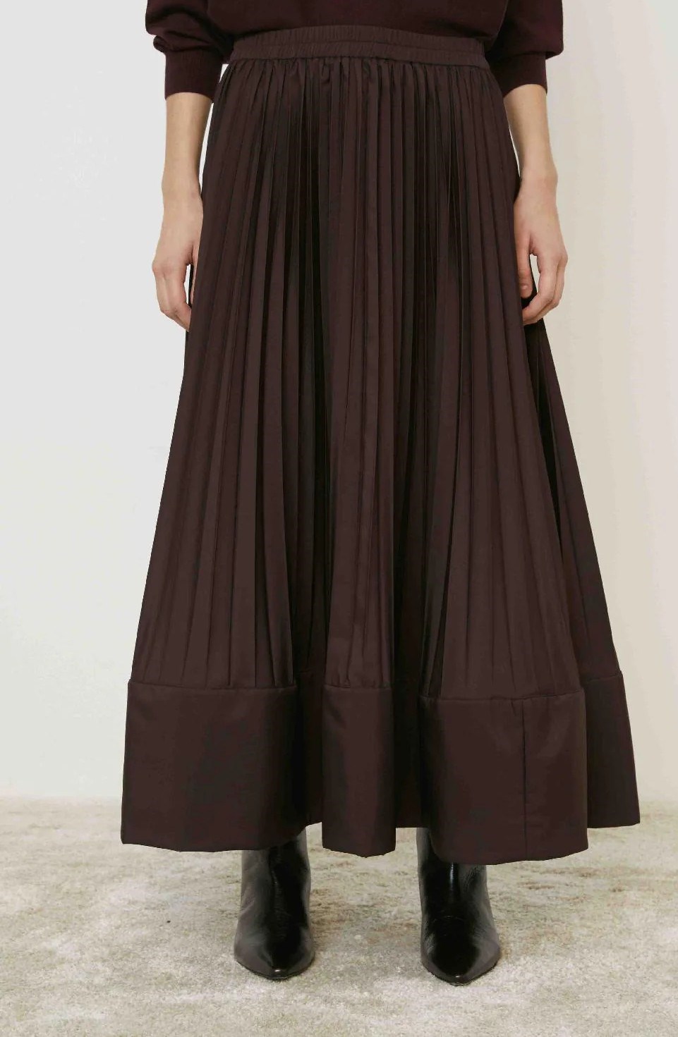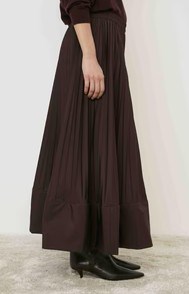A long pleated SKIRT that reaches the ankles. This skirt is dark brown in color and features a wide hem at the bottom. The pleats are evenly spaced and run vertically from the waistband to the hem. The skirt is paired with black boots and a matching dark brown top.