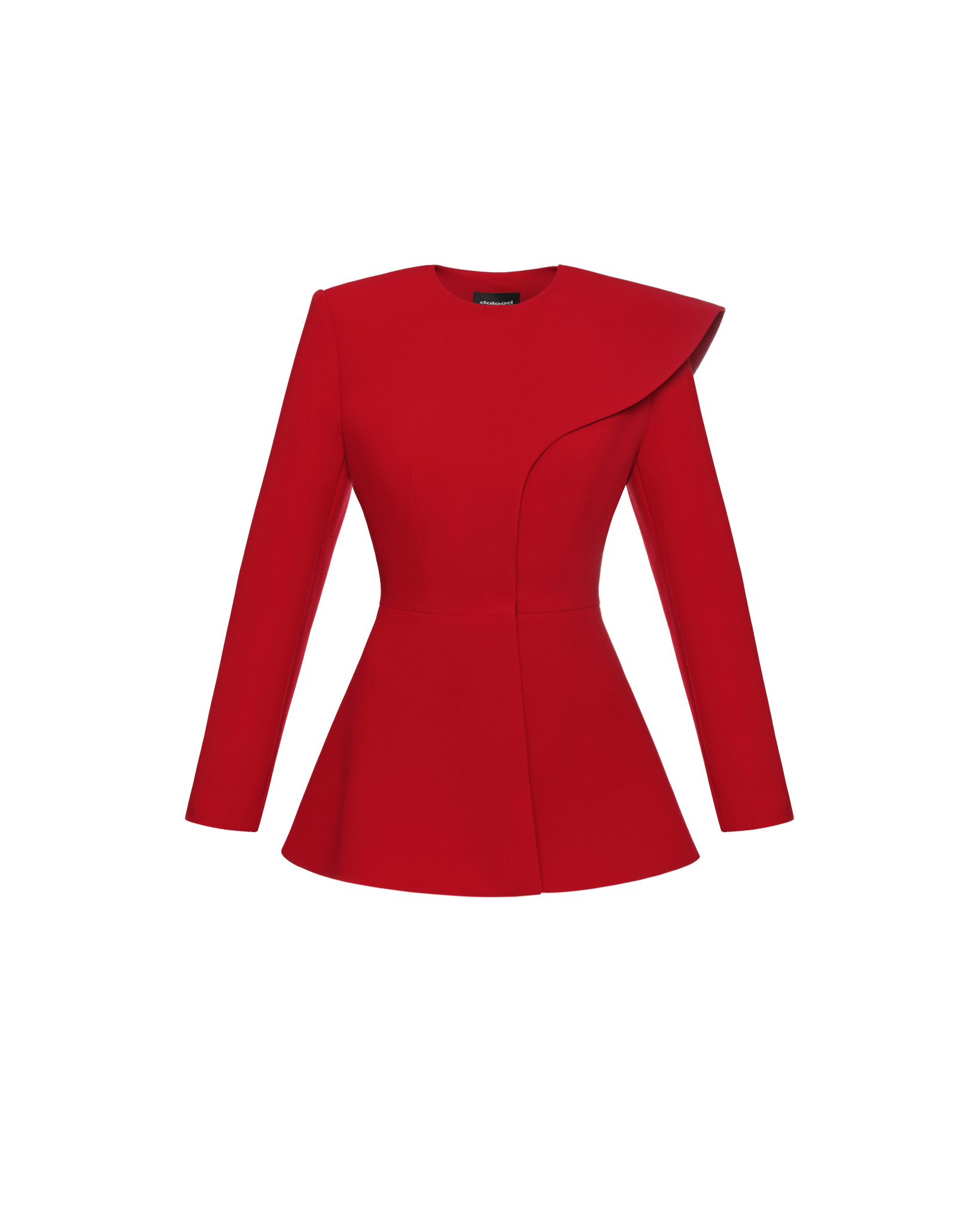 The "Sophie blazer" is made of 100% viscose, with a round neck, long sleeves, padded shoulders and asymmetrical silhouette.