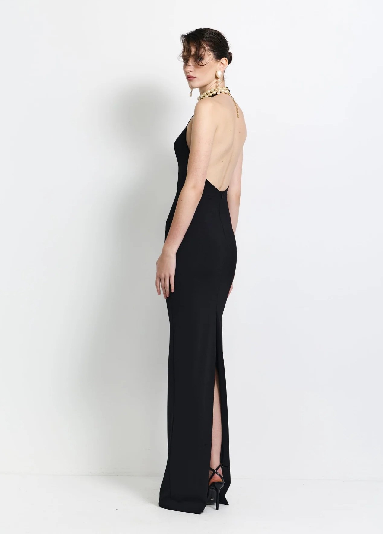 The fabric appears to be smooth and slightly lustrous, giving it a refined eveningwear appeal. The minimalist design focuses on the dramatic neckline and the clean, elongated silhouette.