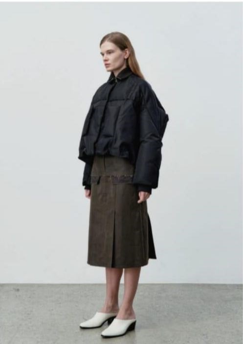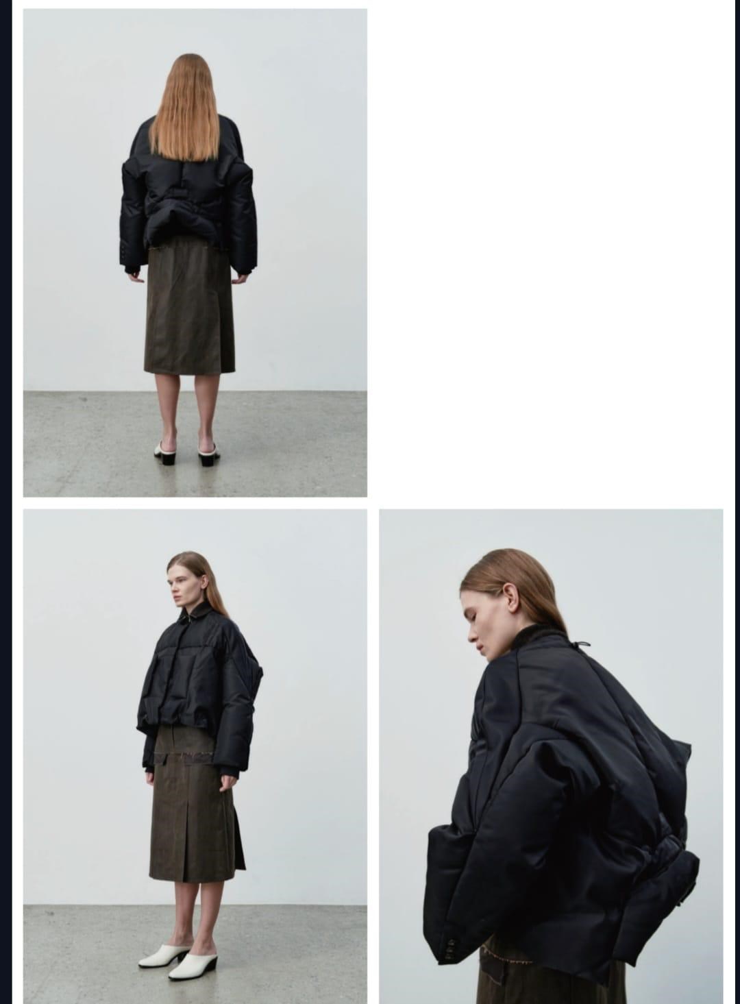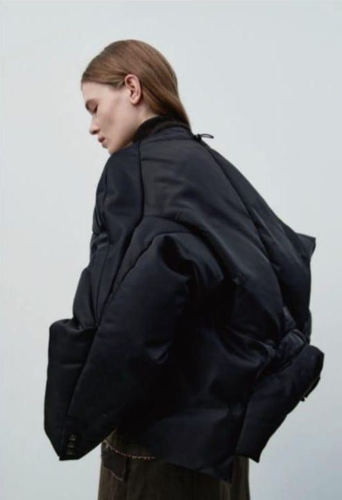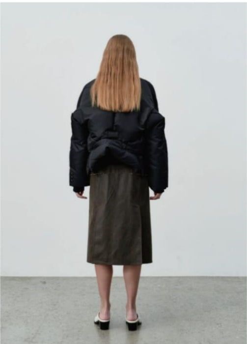 The UPSIDE DOWN GOOSE DOWN JUMPER appears to be a puffer jacket with a unique design. It features a quilted patternand is likely filled with down or synthetic insulation, providing warmth. The jacket has a cropped length, ending above the hips, and includes large, padded pockets on the front, which contribute to its distinctive look. The sleeves are long and slightly oversized, adding to the overall voluminous appearance of the jacket. The material seems to be a matte black fabric, giving it a sleek and modern aesthetic.