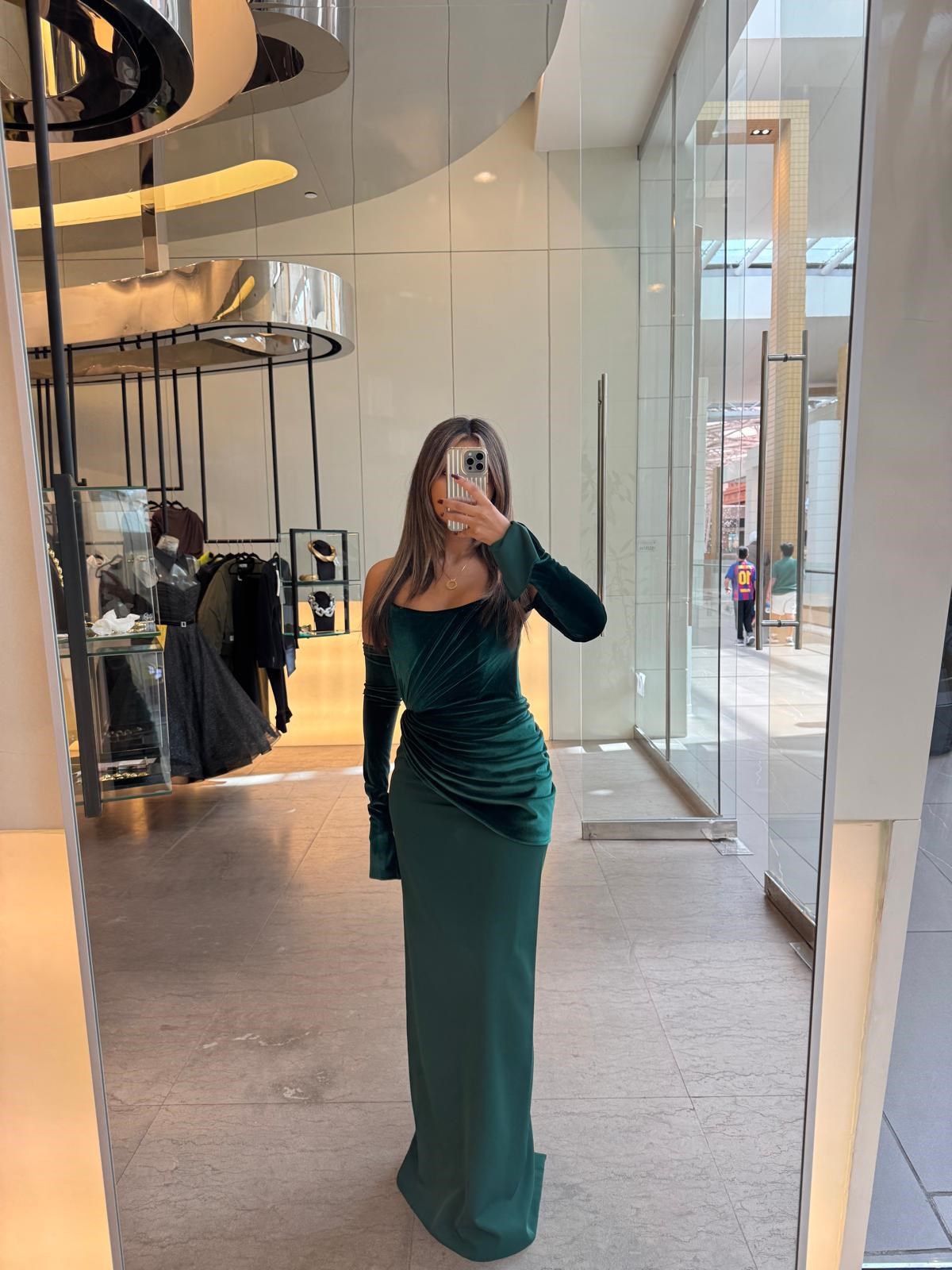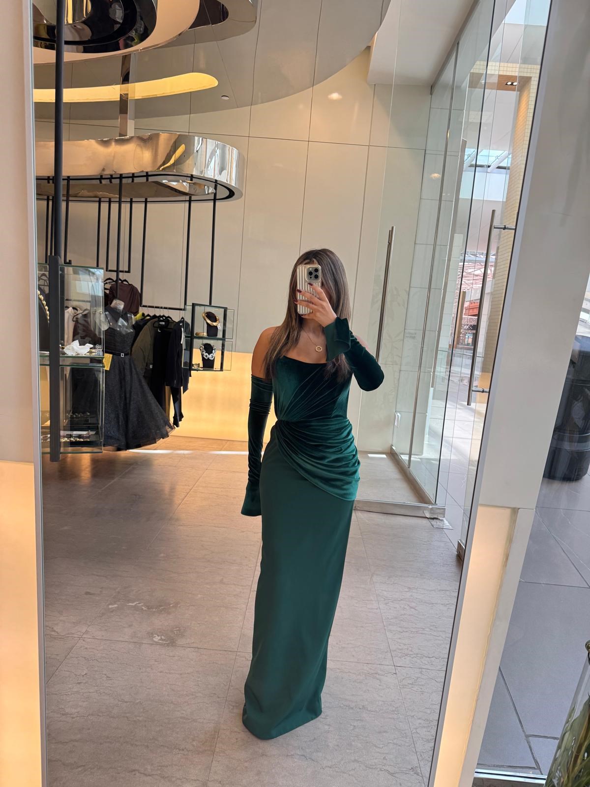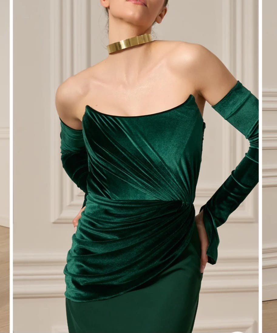 This Glamorous green velvet evening gown. The dress features a one-shoulder design with a draped effect across the bodice. The fabric appears to be luxurious velvet, giving it a rich and elegant look. The gown has a fitted silhouette that accentuates the waist and flows down to the floor, creating a sleek and sophisticated appearance. The dress also includes long sleeves that match the overall design. while the matching gloves lend a touch of vintage glamour. adding to its formal and stylish appeal. A gold choker complements the outfit, enhancing its elegance. The close fit ensures a flattering, elongated shape that’s perfect for evening occasions.