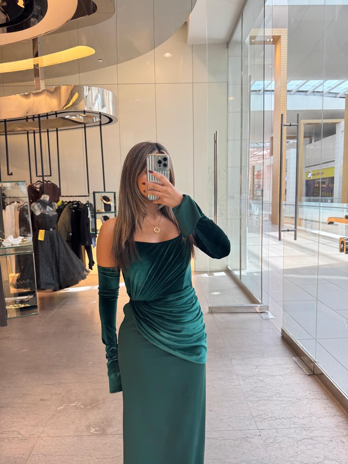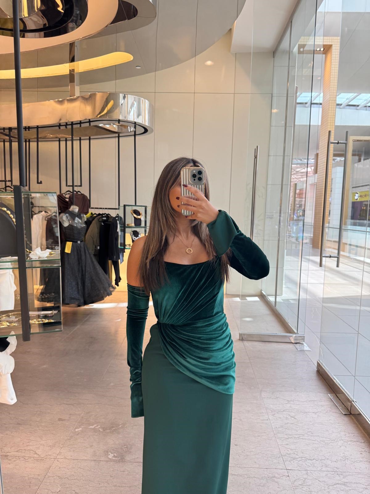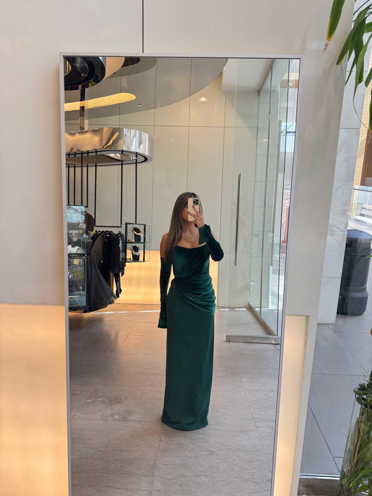 This Glamorous green velvet evening gown. The dress features a one-shoulder design with a draped effect across the bodice. The fabric appears to be luxurious velvet, giving it a rich and elegant look. The gown has a fitted silhouette that accentuates the waist and flows down to the floor, creating a sleek and sophisticated appearance. The dress also includes long sleeves that match the overall design. while the matching gloves lend a touch of vintage glamour. adding to its formal and stylish appeal. A gold choker complements the outfit, enhancing its elegance. The close fit ensures a flattering, elongated shape that’s perfect for evening occasions.